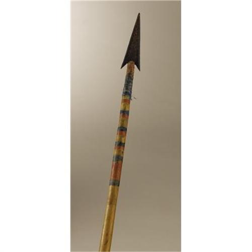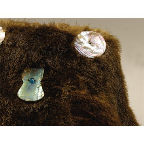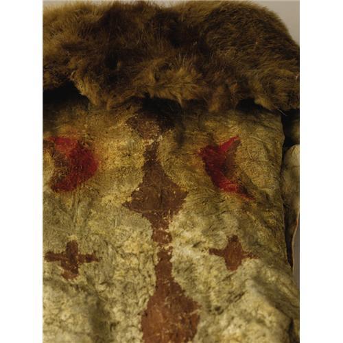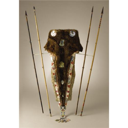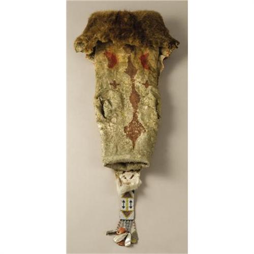 <B>Hupa Otter Fur Quiver with Arrows</B></I><BR>Circa 1880<BR>Length 27 in. quiver; Length 31 1/4 in. the longest arrow<BR><BR>This rare quiver is made from a whole tanned otter skin. The lower body and tail have been folded over and back to create a decorative pendant. This area is decorated with abalone shell along its border and down the center. A tab of loom woven beadwork with bead fringe and shell pendants finishes the tail decoration. In addition, diamond and star motifs are painted on the inner surface of the hide. The quiver comes with four equally rare Hupa arrows, three with finely crafted iron points, and one with a chipped flint point.<BR>Two northern California quivers are noted in Mason's landmark study and should be reviewed and compared. One is a quiver made of deerskin from the McCloud River area and the second is made of coyote fur and attributed to the Hupa. (See: Mason, Otis Tufton, <I>North American Bows, Arrows, and Quivers,</B></I> Smithsonian Report for 1893, Washington, D.C., 1894, Plates 91 and 92.) An albumen print in the collections of The Peabody Museum of Natural History, Yale University depicts a Hupa couple in a studio setting. The man is holding an otter fur quiver very similar to this example. (See: Bush, Alfred L. and Mitchell, Lee Clark, <I>The Photograph and the American Indian,</B></I> Princeton, New Jersey, 1994, p. 168.) Another quiver, also made of otter fur, is attributed to the Karuk. (See: Baldwin, John, <I>Bows, Arrows, and Quivers of the American Frontier,</B></I> Early American Artistry Trading Company, West Olive, Michigan, 1999, p. 92, figure 132.)<BR><BR>Provenance<BR>Richard Corrow Collection, Santa Fe, New Mexico.<BR><BR>