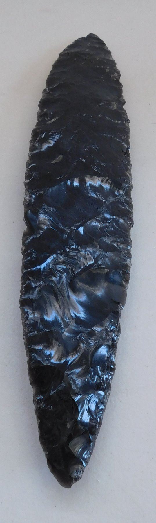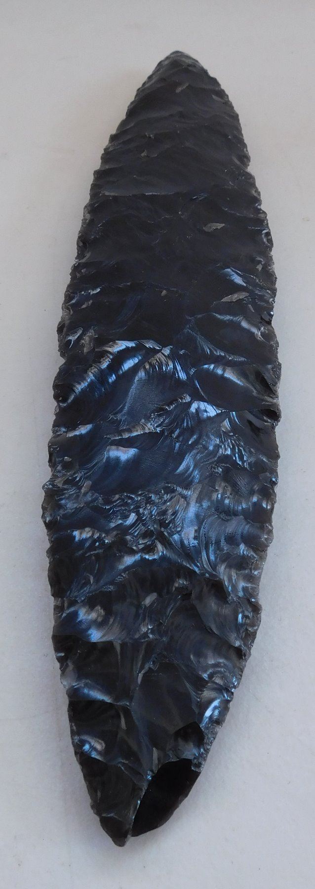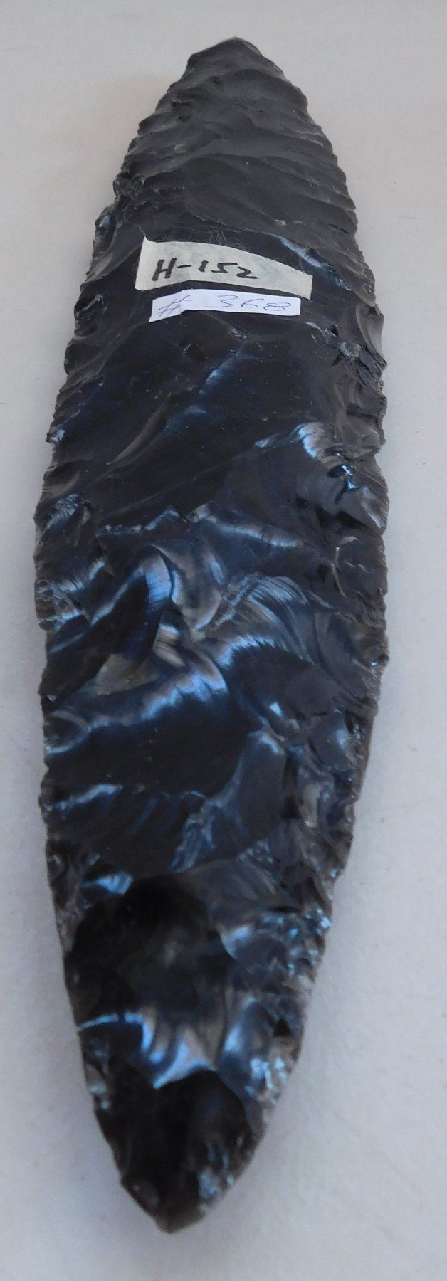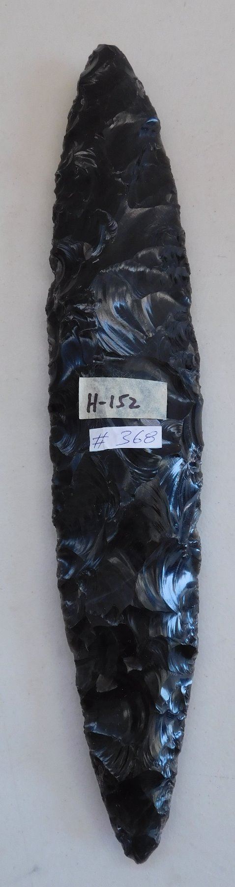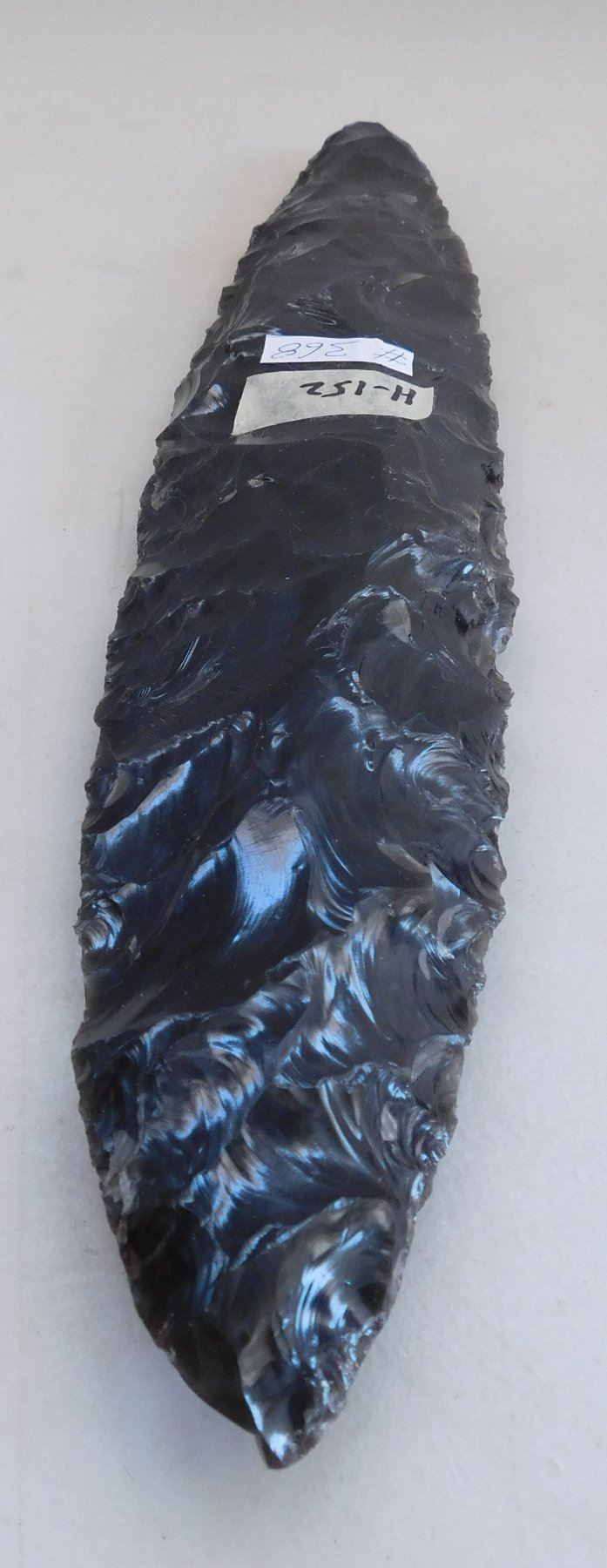 Hupa Treasure Blade, early historic. Made of obsidian, the item measures 15 1/2" x 3". Central California. Nice looking blade. Condition: Minor wear and nicks, see images. Shipping: $34.50 w/insurance and signature, due to length and value.