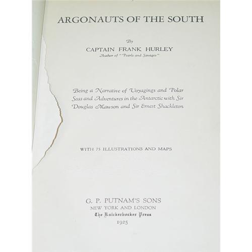 Hurley, Captain Frank. Argonauts of the South - Being a Narrative of Voyagings and Polar Seas and Adventures in the Antarctic with Sir Douglas Mawson and Sir Ernest Shackleton. New York: G.P. Putnam's Sons, 1925. First Edition. 8vo - over 7¾" - 9¾" tall. Hard Cover. Ex-Library. Good Condition. xv [1] 290pp in a library binding, with binding & hinges tight. 2 folding maps (1 with tears), lacks frontis, b/w photographic plates throughout
