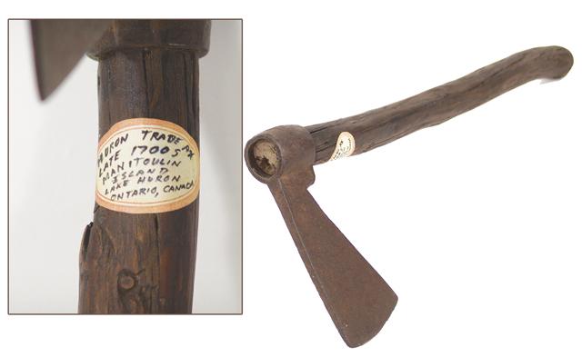 Late 1700s, Early iron trade axe hallmarked PJS, mounted on possibly the original haft - old tag reads "Manitoulin Island, Lake Huron, Ontario, Canada". 23-1/2" x 7-1/2"