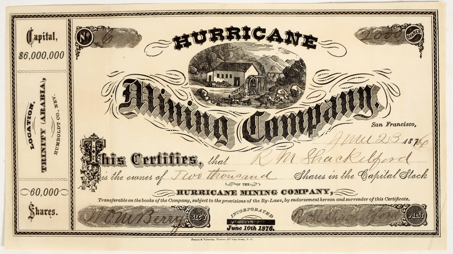 I/U. Hurricane Mining Co. Stock, issued 1876, vignette of water driven mill, excellent cond. Location: Trinity (Arabia), Humboldt Co., Nevada.. Francis and Valentine printer. The Arabia district was discovered by George Lovelock in 1859 and was one of Nevada's first organized mining districts. It was originally in Humboldt Co. The first big mine there was the Montezuma. The district produced about $1 million according to Lincoln, but was omitted by C&C. Not in Burchard or Raymond.