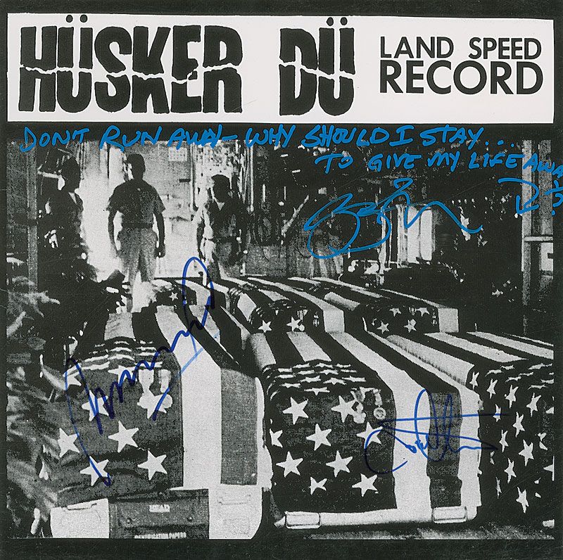 Land Speed Record album signed on the front cover in blue felt tip and ink by Bob Mould, Grant Hart, and Greg Norton, who adds a line from the song ‘Let's Go Die’: “Don’t run away—why should I stay…to give my life away?” In fine condition. The record is included.