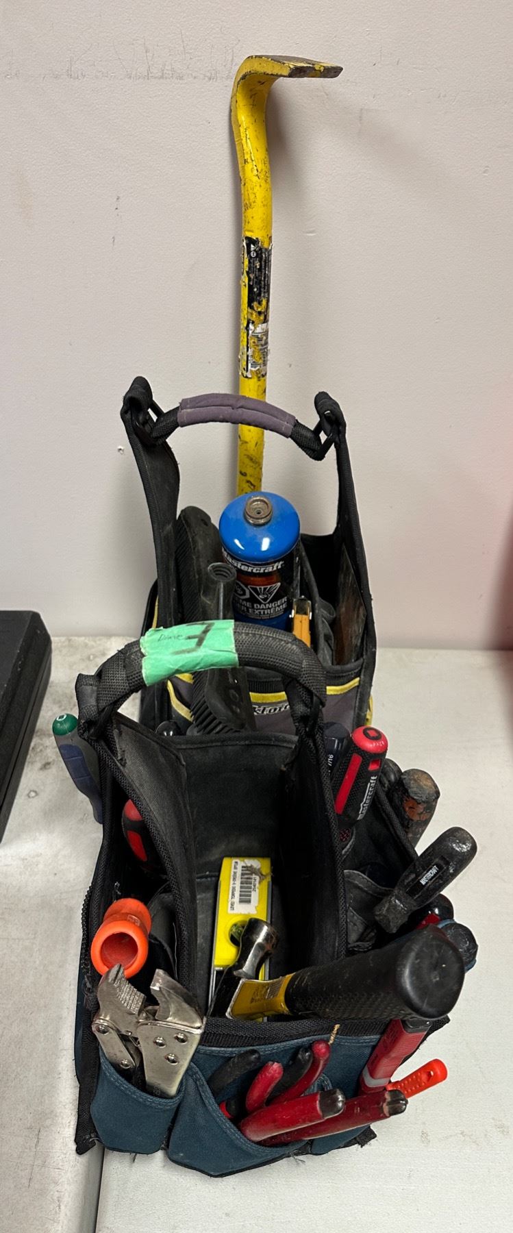 Husky & Workforce toolbag full of assorted tools & misc - includes Stanley crowbar / Mastercraft propane / screwdrivers / hammers