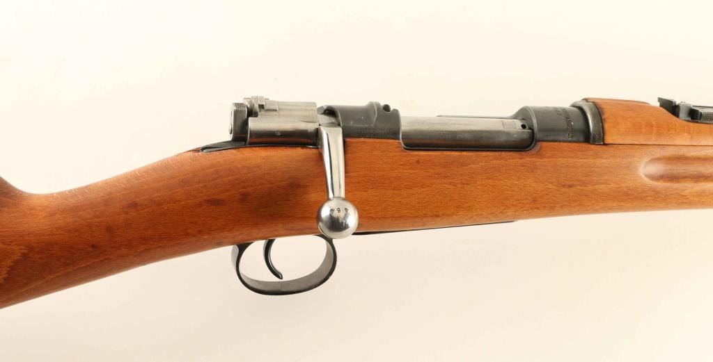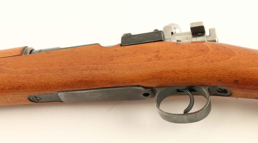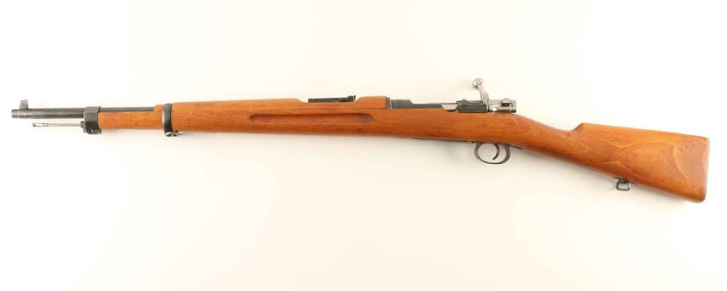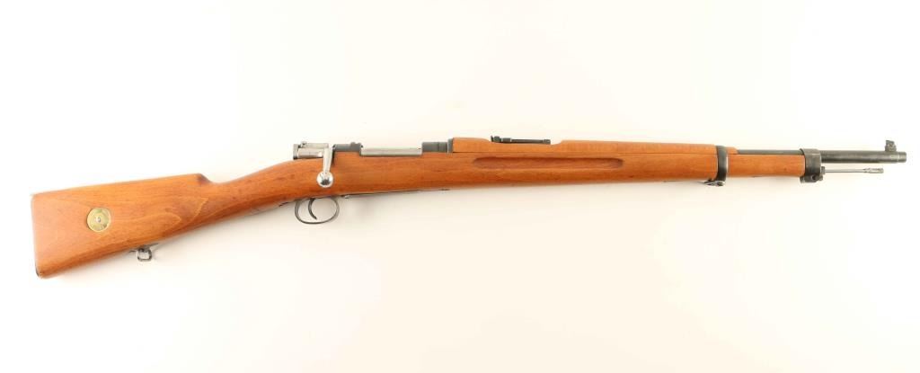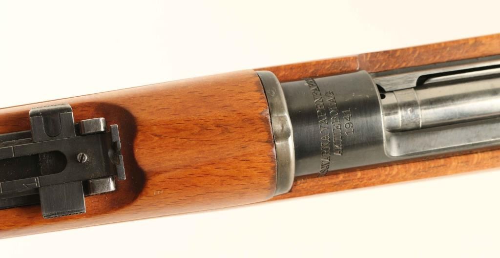 WWII era Swedish military bolt action service rifle chambered in 6.5x55mm Swedish, manufactured circa 1941. Imported by Classic Distributors of Swan, V.T. with small import marks on the underside of the barrel. Features a blued finish, 23.5" barrel, dovetailed +025 patridge front sight on +075 base, tangent rear sight graduated to 600 meters, cleaning rod, bayonet lug, smooth trigger, internal 5 round box magazine, integral stripper clip guide cuts in the receiver, polished bolt with turned-down handle & three-position manual safety on the rear, sling swivels, smooth wood handguard and straight grip shoulder stock with finger grooves in the forend, inlayed brass disc on the right side of the butt & a smooth metal buttplate. Serial numbers match on the receiver, bolt knob, cocking piece(electro pencil), bolt sleeve(electro pencil), safety and buttplate with no other numbers observed. The stock disk is marked 6.51" bore diameter, #1 bore condition and 0 holdover. Rifle retains approximately 80% of it's blued finish showing thinning, finish loss on the bottom metal & floorplate and several small dings on the barrel. Action is smooth, the bore is very good+ and the wood stocks are near fine. Condition is NRA Very Good+. ***C&R Firearm***