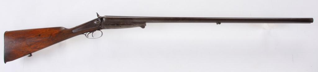 Husqvarna Mdl 17 16 ga SN:5150 Very early double barrel field grade shotgun with external hammers made in Sweden in 1888. Blued barrels, case color receiver, smooth straight grip stock, 31 1/2" barrels, good bores and action, double triggers, sling sVery early double barrel field grade shotgun with external hammers made in Sweden in 1888. Blued barrels, case color receiver, smooth straight grip stock, 31 1/2" barrels, good bores and action, double triggers, sling swivels, steel butt plate,barrel release under the receiver. Condition: Good with barrel finish showing brown patina with small dent in right tube and some erosion at the muzzle, receiver shows 20% finish. Stock has been stripped and refinished.