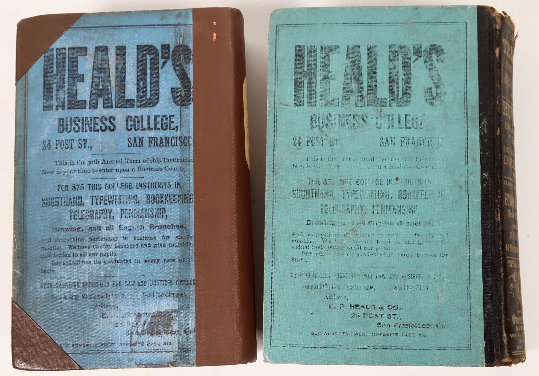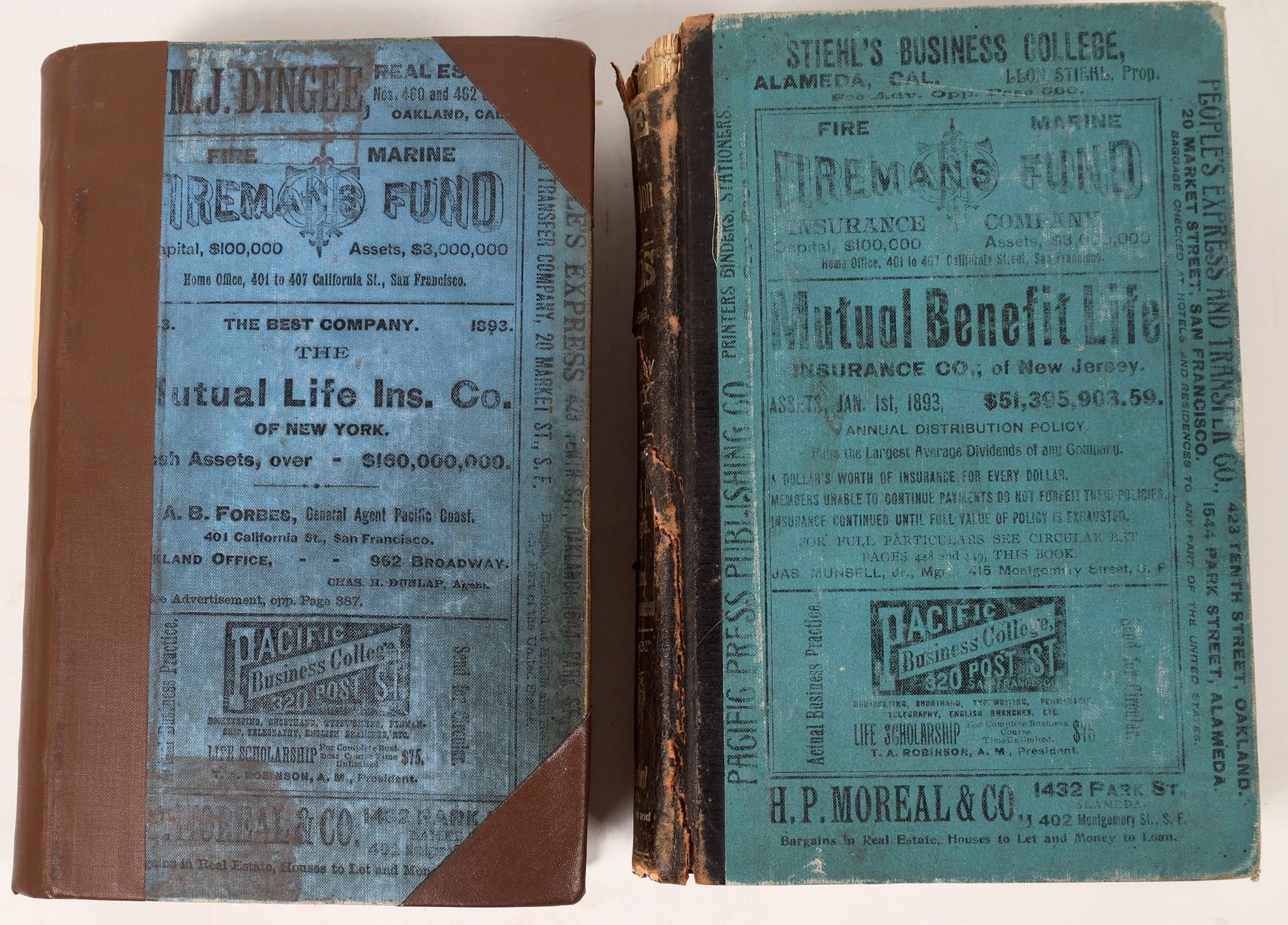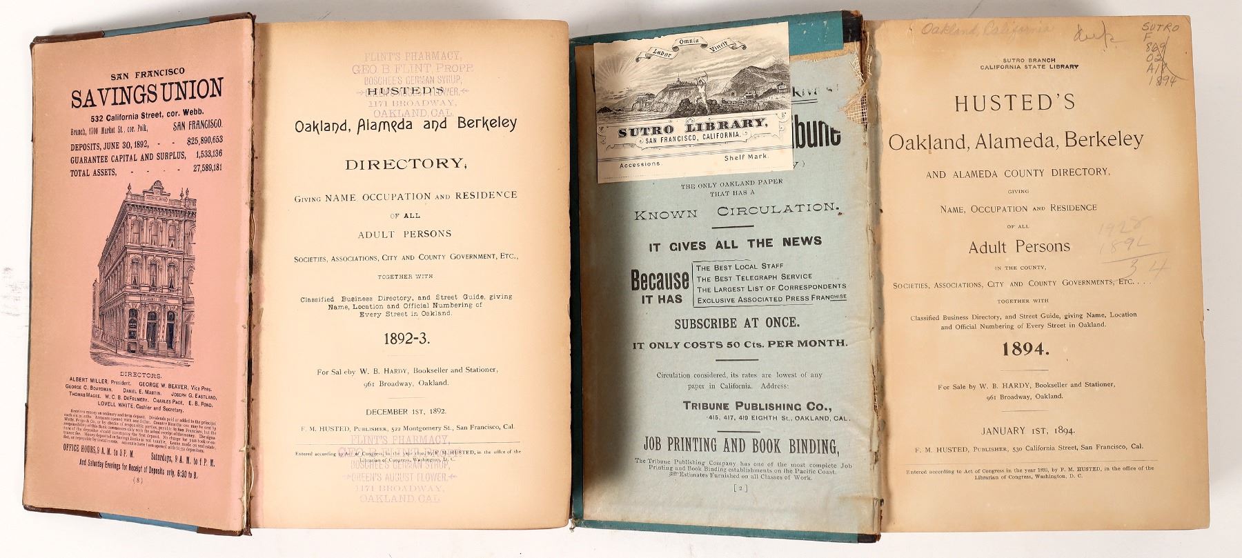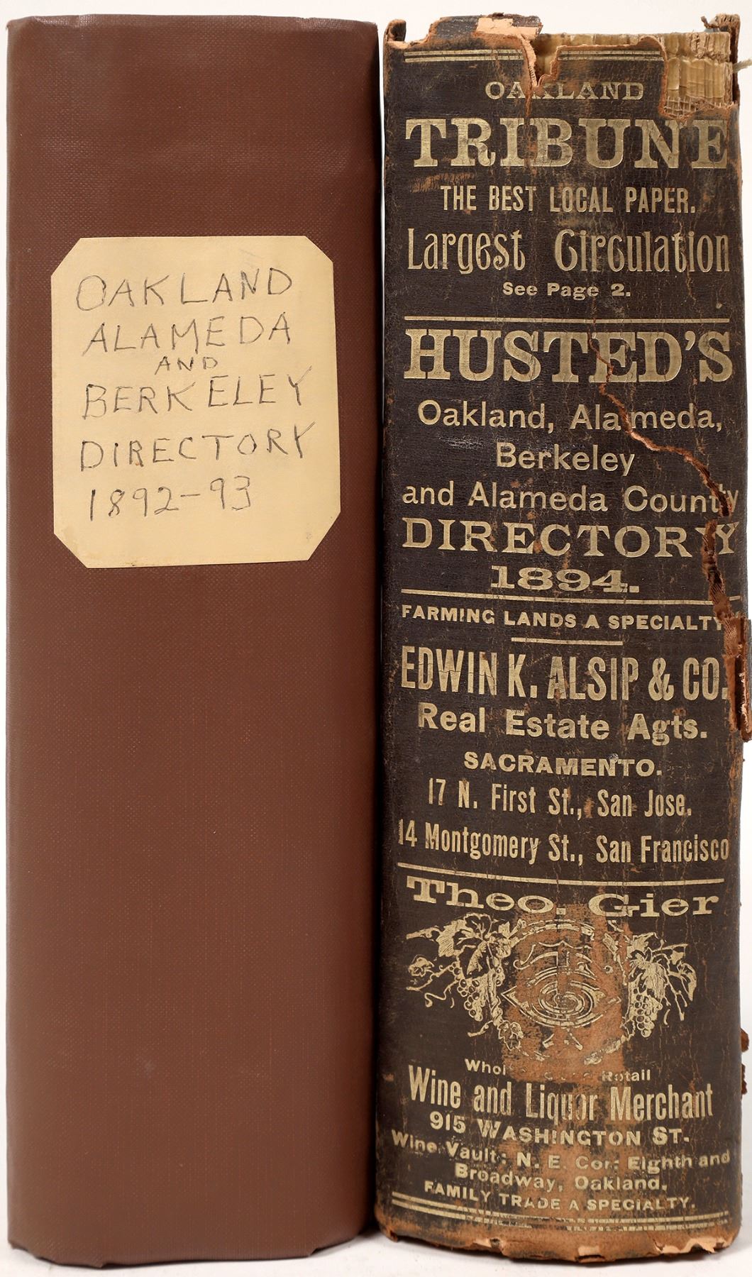Two volumes of Husted's Oakland, Alameda, and Berkeley Directory for 1892-93 and 1894. The 1892 volume also includes Alameda County. Both volumes are paginated by city, and each section begins with an overview of the city's population, government, fire department, police department, schools, banks, cemeteries, churches, courts, hospitals, libraries, newspapers, parks, post offices, societies, etc. The directories give the names, occupations, and residences of all adult persons in the cities. Classified business directories are also included. A street guide of Oakland is included in both volumes. Business advertisements throughout. 9.25 x 6, good condition, 1892 volume's spine and cover corners have been taped.