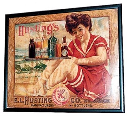 Very unusual piece that shows a variety of Husting beverages, seltzer waters and the Coca-cola bottle with their name tag on the top of the neck of the bottle above the diamond label. Never seen or heard of this piece. The graphics are great. Cond. only about a 6.0 with some warping staining, paper chipping and loss in a number of random areas from insect damage and general wear. Still has a great look and wonderful subject.