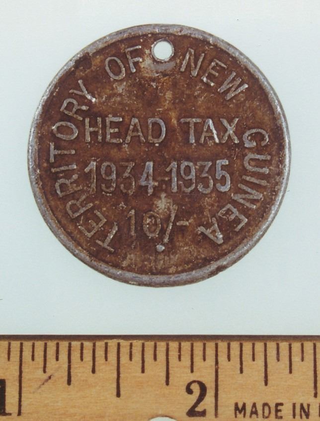 Description: Hut or head tax token 1934-35, Papua New Guinea.