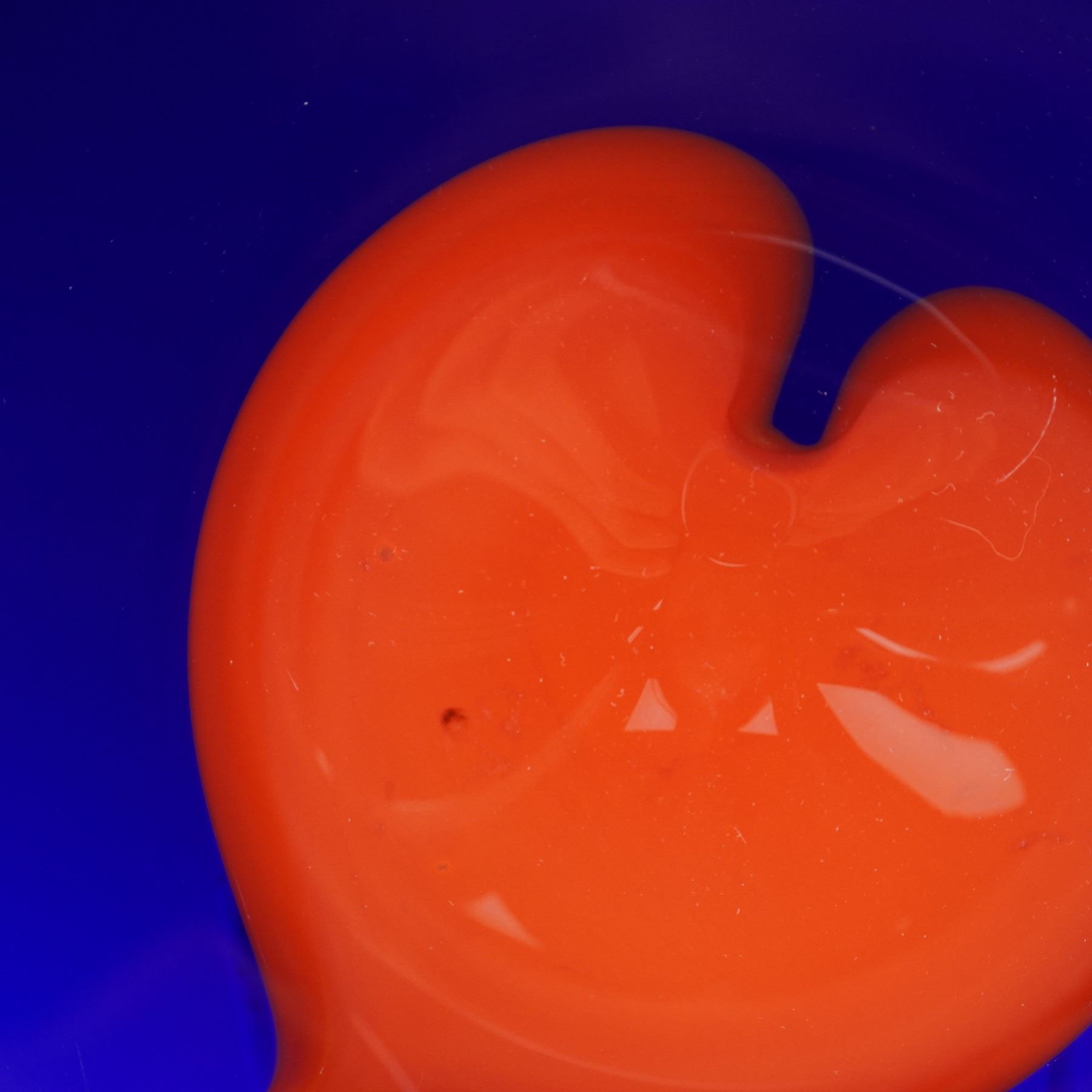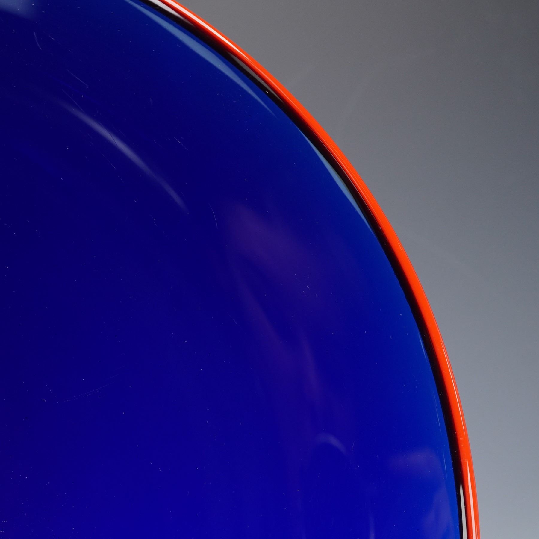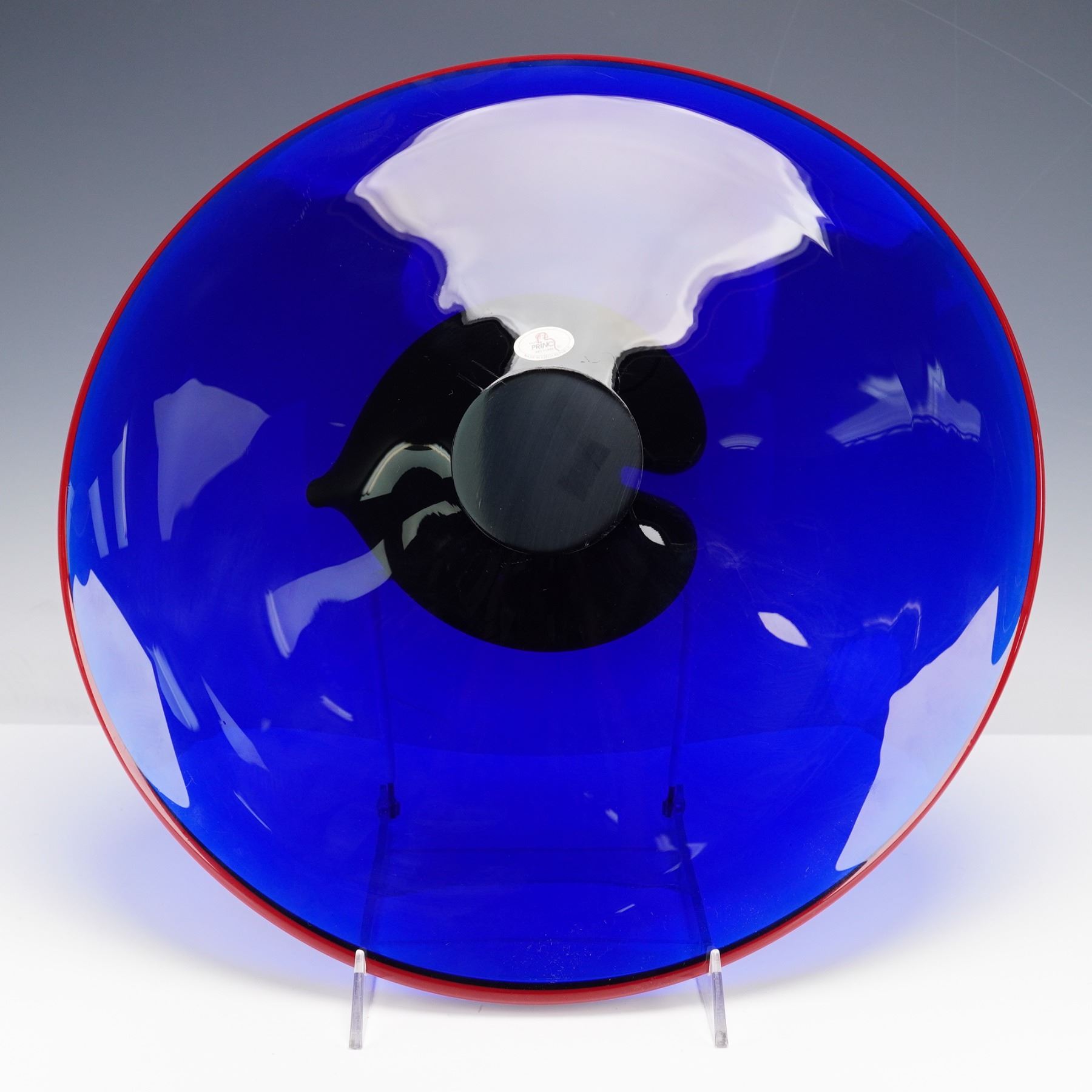 Deep cobalt blue glass accented with a vivid red heart at its center. A thin red rim outlines the circular form, adding contrast and definition to its smooth surface. Hut Princ manufacturing label.