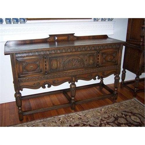 Sideboard: One large middle drawer (17X24) opens to contain a sliding three section silverware tray (12X16) that has a felt lining; the drawer is constructed of machine dovetail work. Each same size doors flank each end (10X13) for additional storage; the same acanthus leaf pattern under the front apron area matches the hutch as well as the leaf and round "bulbous" incised sections found in the legs. Wonderful stylized tulip pattern and elongated leaf pattern balances the symmetrical detail. 66" length X 20" depth X 40" height from floor to top of backsplash.</font>