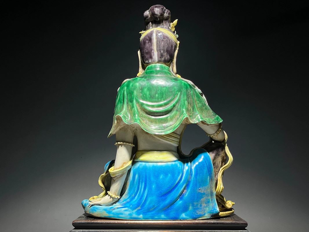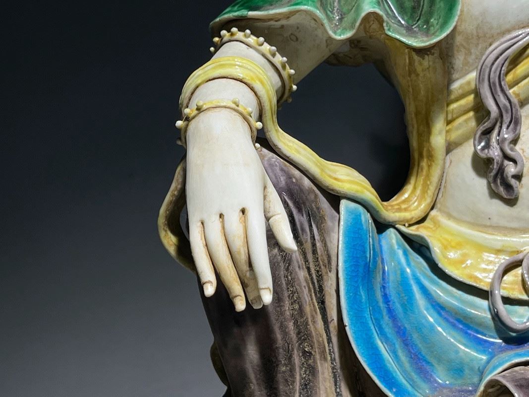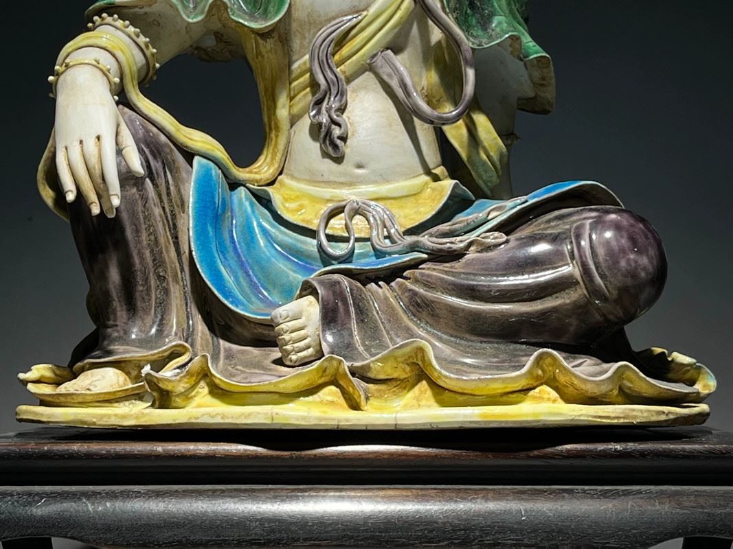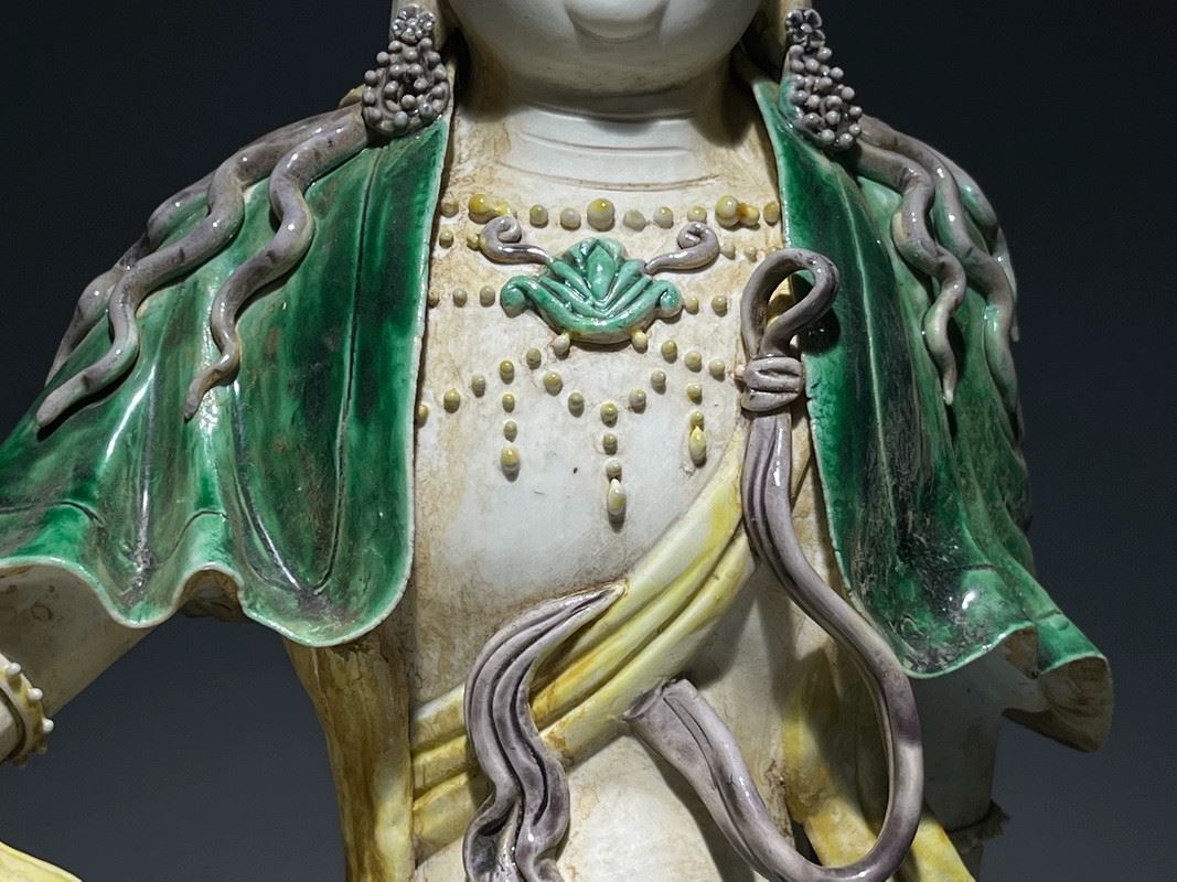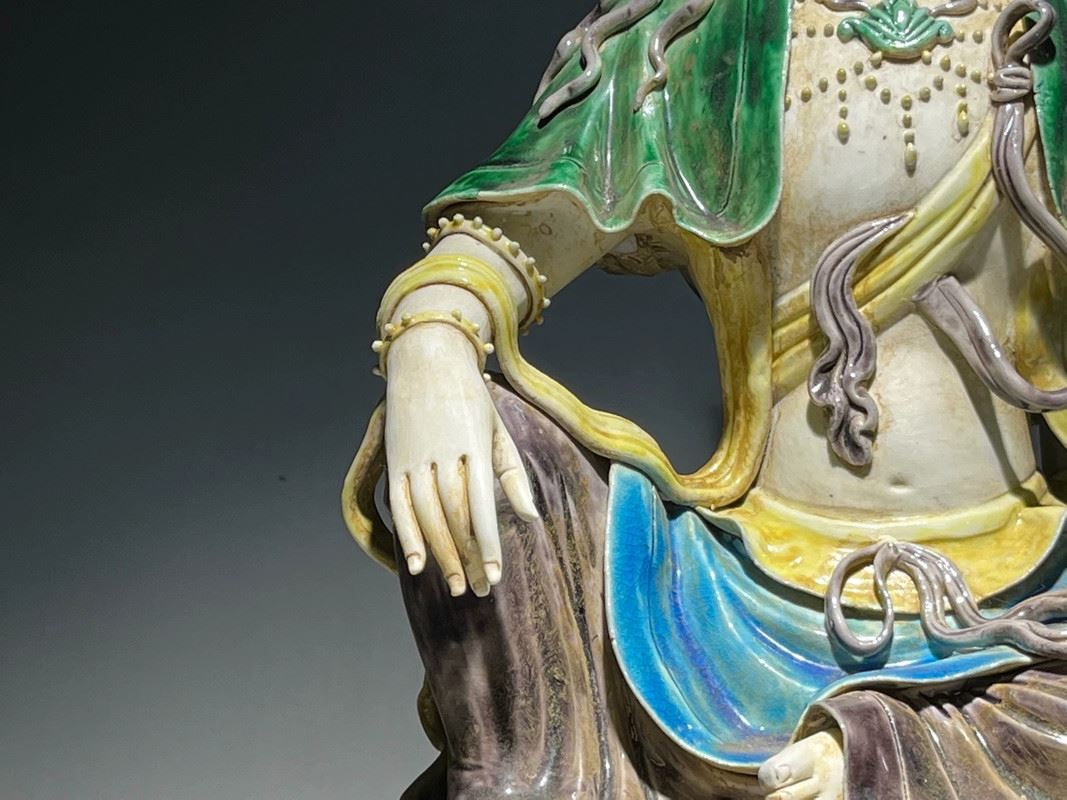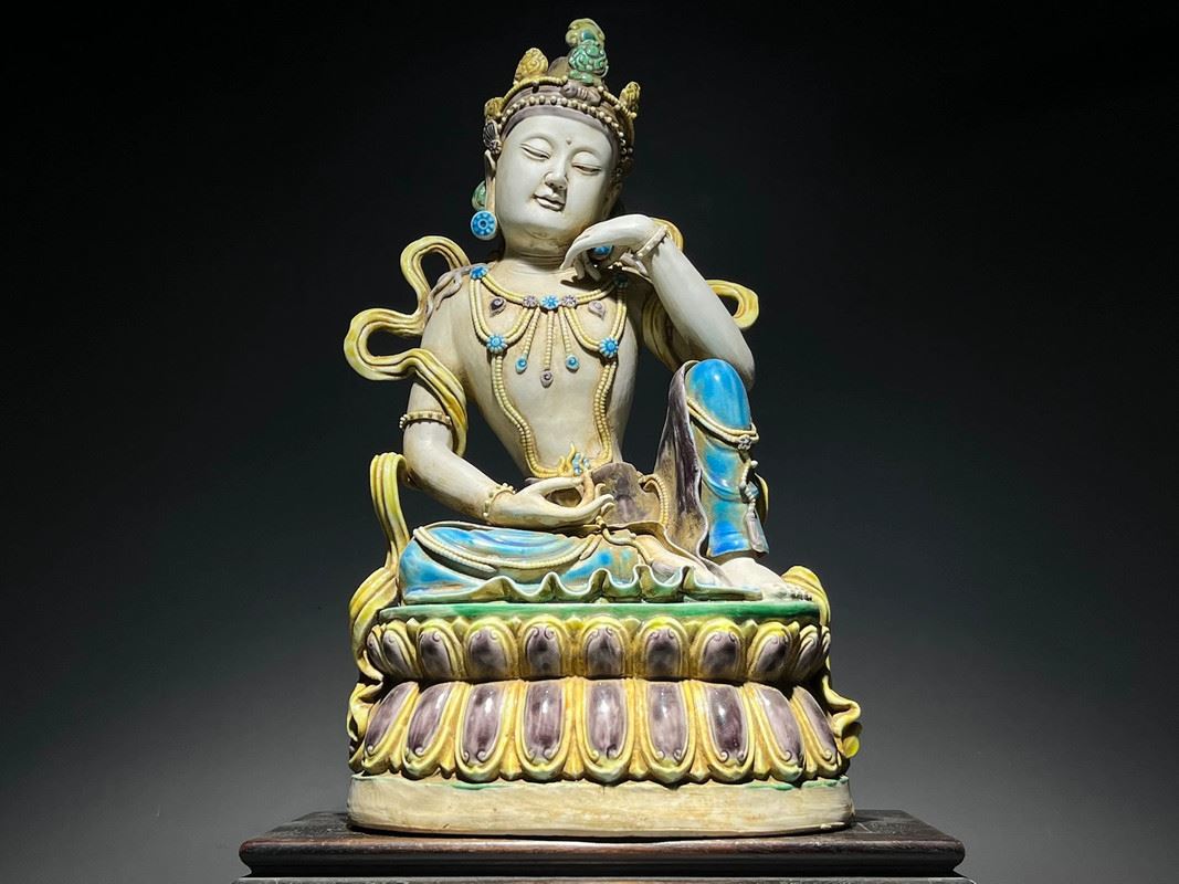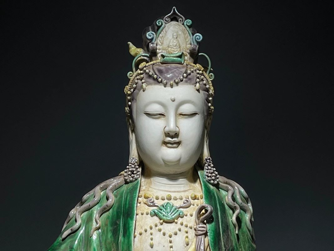 This Buddha statue originates from the Hutian Kiln, renowned for its delicate glazes and exquisite carvings. The figure displays typical characteristics of Buddhist sculpture, with a finely crafted hairbun and earrings, its serene expression evoking a sense of transcendence. The unique glazes and craftsmanship of the Hutian Kiln make the statue appear solemn and sacred, showcasing the masterful skills and rich cultural heritage of ancient artisans.