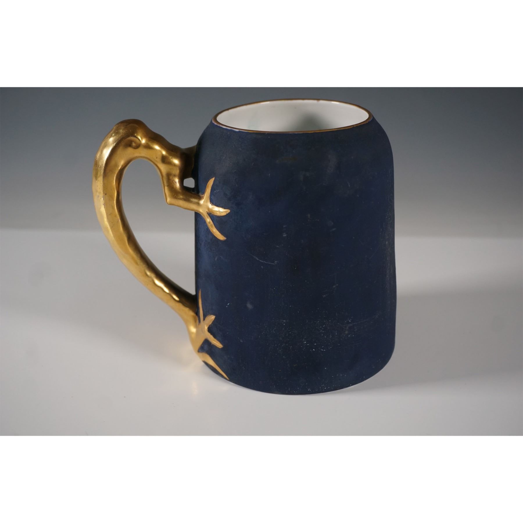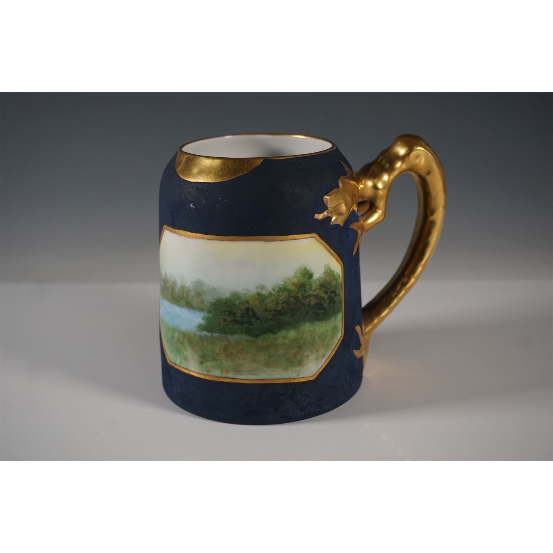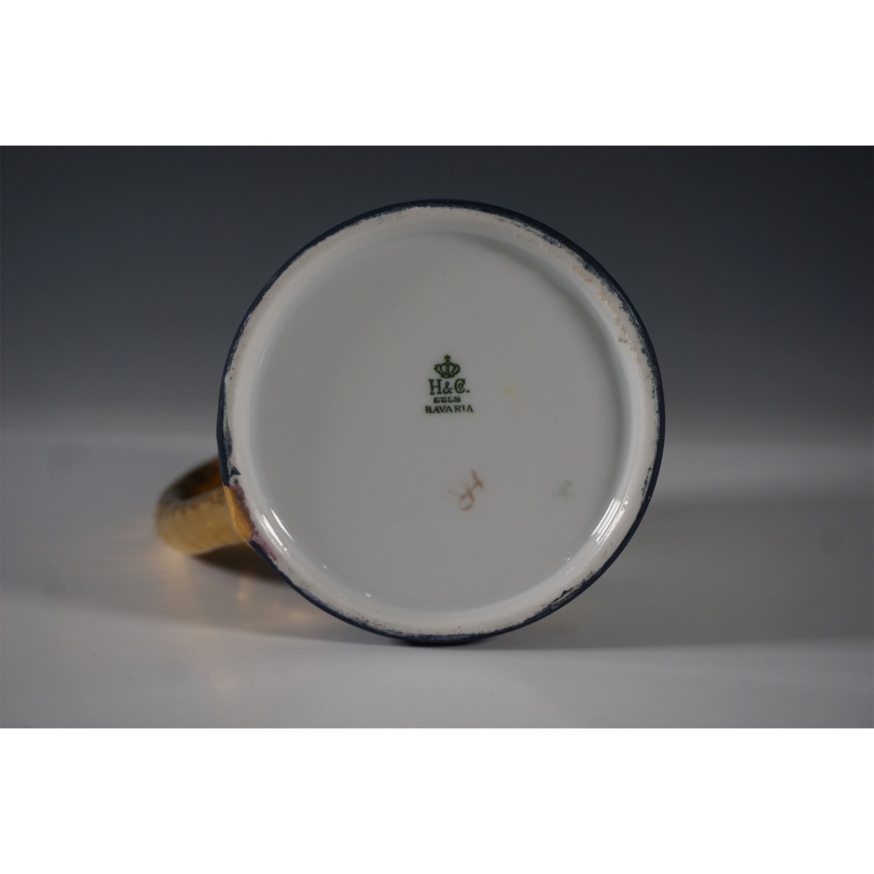This exquisite porcelain mug features a hand-painted landscape scene with a tranquil river and lush greenery, framed by a gilded border. The mug is accentuated by a unique gold lizard handle, adding a touch of elegance and sophistication. The porcelain bears the backstamp "H&C Selb Bavaria," along with a crown mark, indicating its fine craftsmanship. The gilded details on the top rim and handle show slight wear, adding to the vintage appeal. A stunning collector's piece for those appreciating high-quality porcelain with intricate detailing.