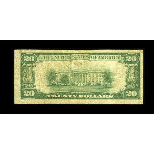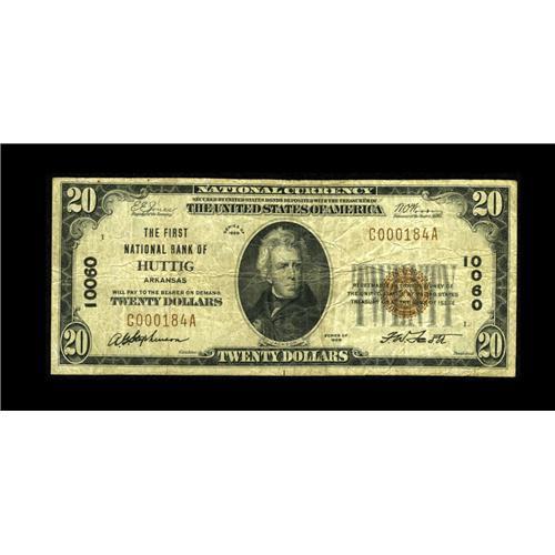 <B>Huttig, AR</B></I> - $20 1929 Ty. 1 <B>The First NB</B></I> Ch. # 10060<BR>This is a truly rare note which comes from the only bank to issue in in this rural Union County location. Only one large and four small notes are listed in the census, with those pieces having been closely held for many years, as our records indicate that it has been eighteen years since the large note was offered publicly and twenty years since any small example has been available for sale. Evenly circulated <B>Fine.</B></I><BR><BR><b>Shipping:</b> Coin/Currency (<a target="_blank" href="http://www.heritageauctions.com/common/shipping.php">view shipping information</a>)