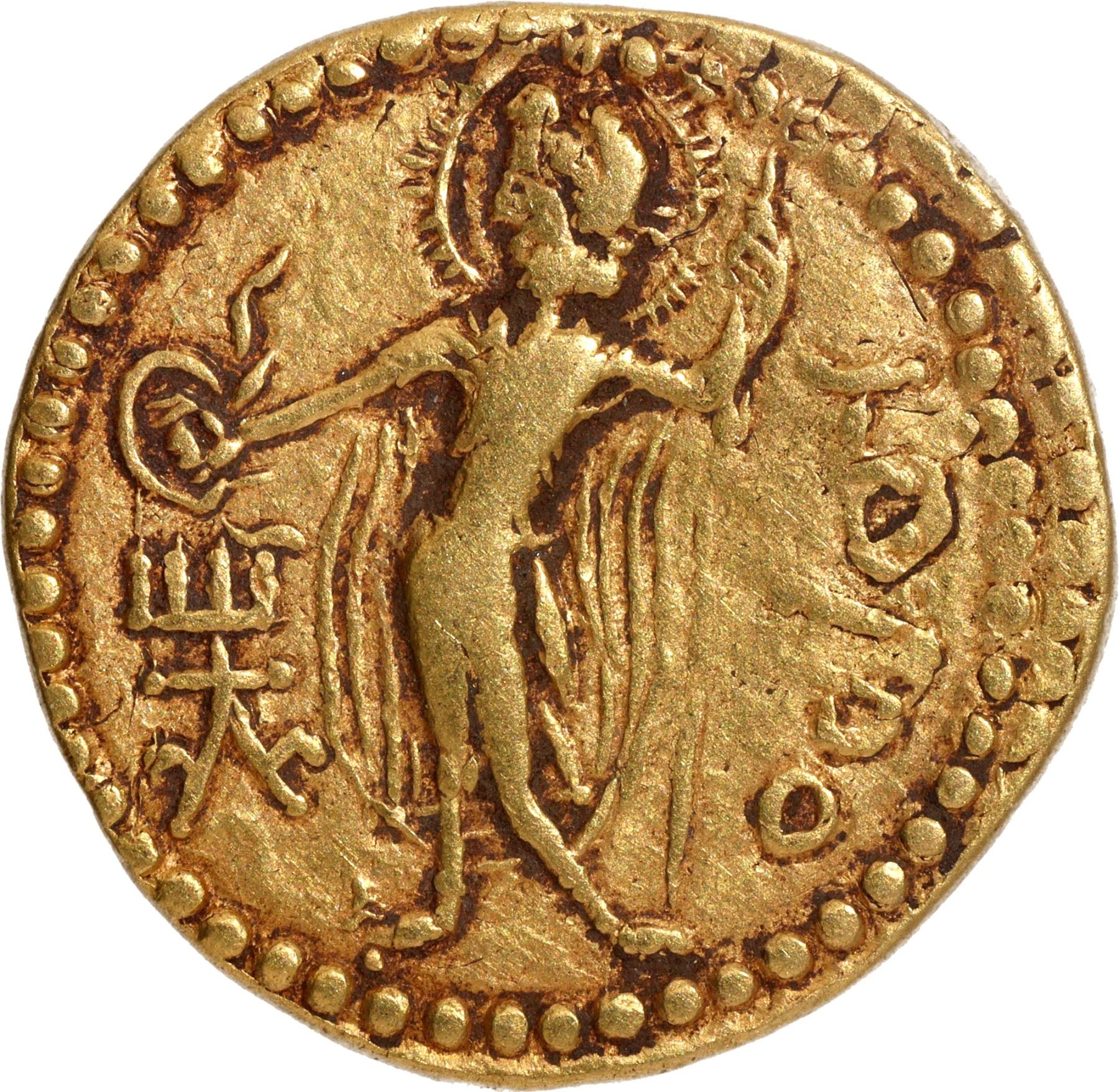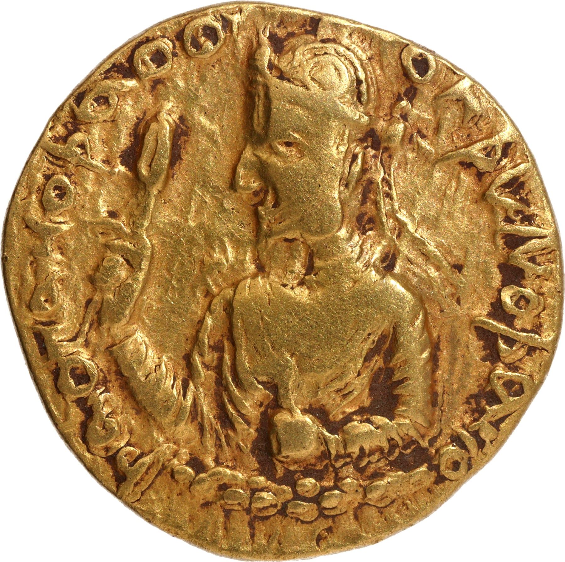 Kushan Dynasty, Huvishka (160-190 CE), Gold Dinar, "MOIPO-MOIRO (Sun God)" type, Main Mint in Bactria (Balkh?), Late phase, Obv: a half-length bust of the king, crowned, diademed,  facing left emerging from clouds, holding a mace-scepter in one hand and an elephant-goad (ankush) in the other, Bactrian legend “ÞAONANOÞAO OO-HÞKI K-OÞANO" Shaonanoshao  Ooishki Koshano” (King of Kings Huvishka, the Kushan) around the field, Rev: the Solar deity Mitra standing, facing left, radiate sun rays behind, raised left hand holding a standard and diadem in outstretched right hand, the Bactrian legend “MOIPO” on the right field, a tamgha on the left field, a dotted border around the field, 7.7g, 16.93mm, (Unlisted), almost completely struck, choice quality,  about very fine, Very Rare.