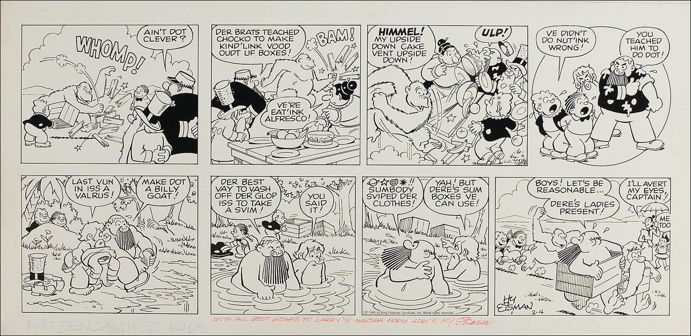 Original hand-inked eight-panel Katzenjammer Kids daily comic strip, dated February 4, 1990 on an off-white 22.5 x 11 piece of artist’s cardstock. Strip depicts a skinny-dipping adventure gone awry. Signed in black ink in the last panel, “Hy Eisman” and signed and inscribed in red artist pencil along the bottom border “With all best wishes to Larry ‘n Marsha from Adri’n. Hy Eisman.” In fine condition.