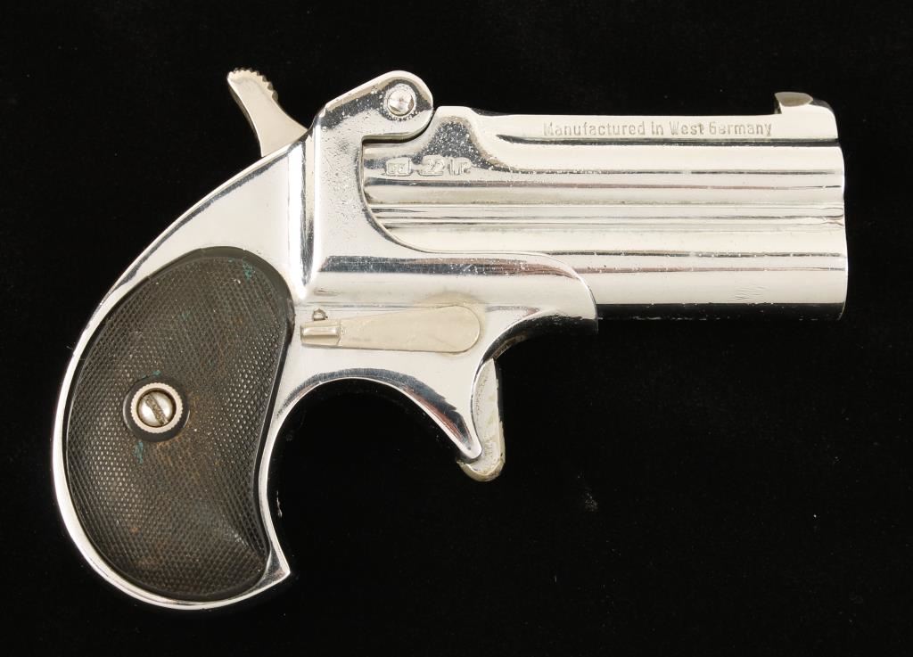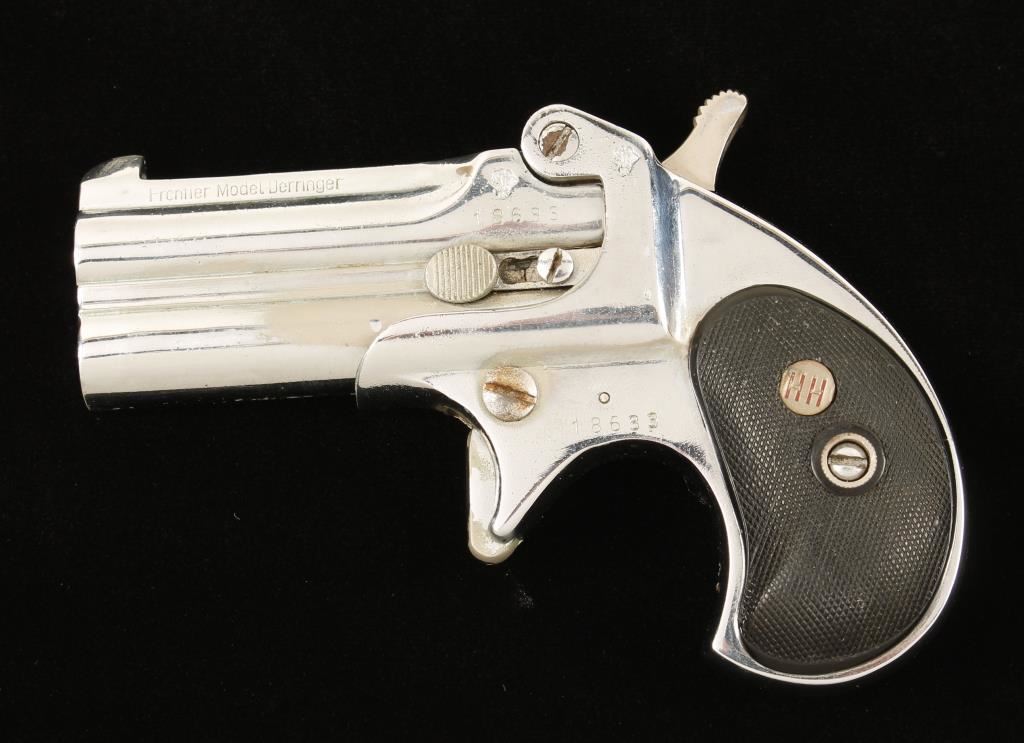 Double barreled nickel plated derringer with plastic hh medallion grips. Overall condition is fair due to heavy wear. *Modern Firearm*