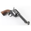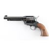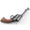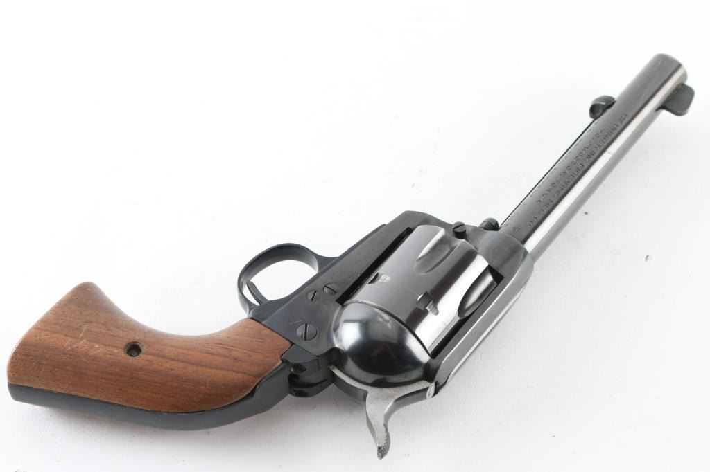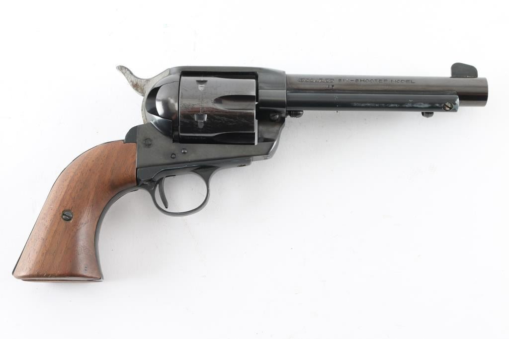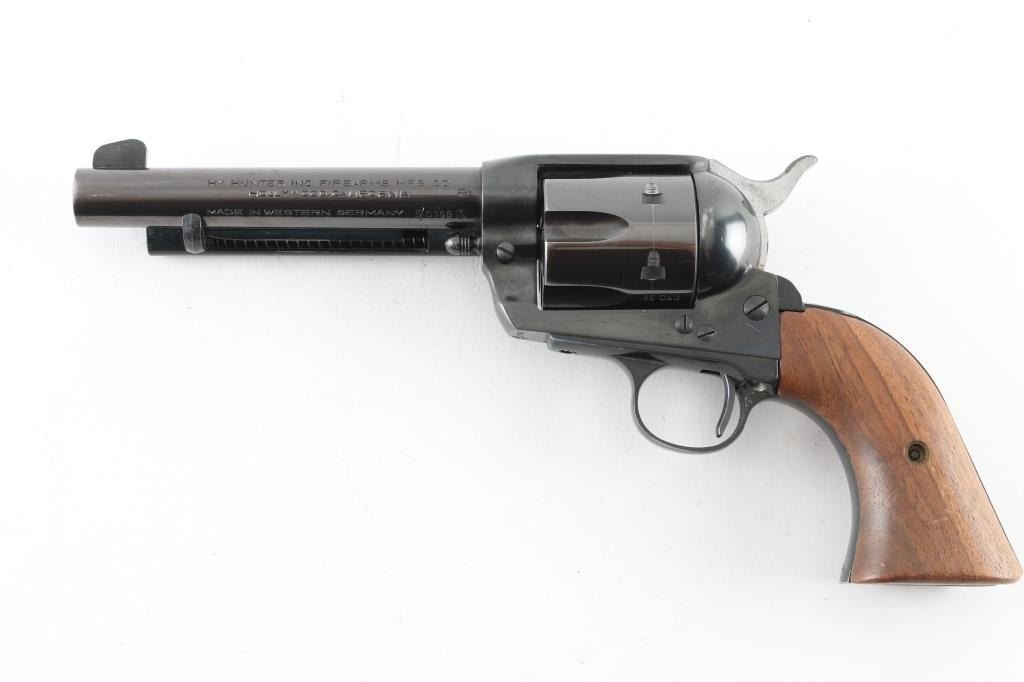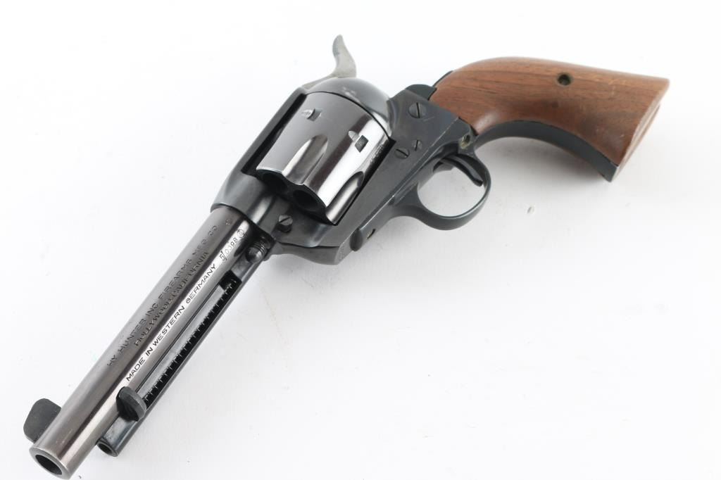 Western Style single action revolver made in West German, imported by Hy Hunter in Hollywood CA. Features 6 shot fluted cylinder, 5.5" barrel with fixed sights, blued finish, smooth walnut grips. Barrel and charge holes are very good condition. Retains 85% finish with edge losses, drag line & scratches on cylinder. Bluing on cylinder is a bit "plum" colored. Grips are very good. Right side of barrel has a word that is obscured by punch marks to obliterate the word before "SIX-SHOOTER MODEL", appears done at factory before finish was applied (probably "Frontier" as this full name belonged to Colt). Action is smooth with good lock-up. Condition is NRA Very Good+ *** Modern Firearm ***