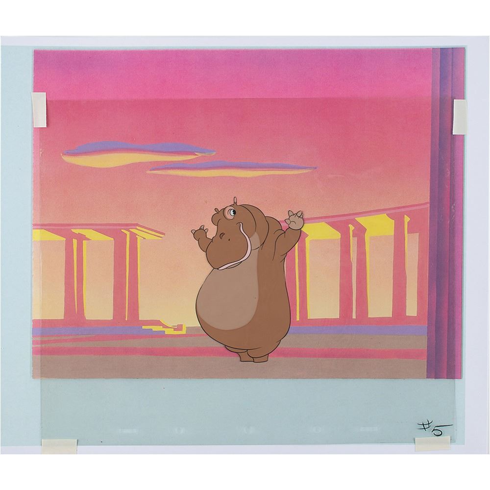 (Walt Disney Studios, 1940) Original production cel of Hyacinth Hippo from Fantasia, which depicts the lovely hippopotamus dancing during the 'Dance of the Hours' sequence. The cel is taped to a matching giclee background. Image measures 3.25 x 4.75, with overall dimensions of 14 x 12. The lower right corner is marked "5." In fine condition.