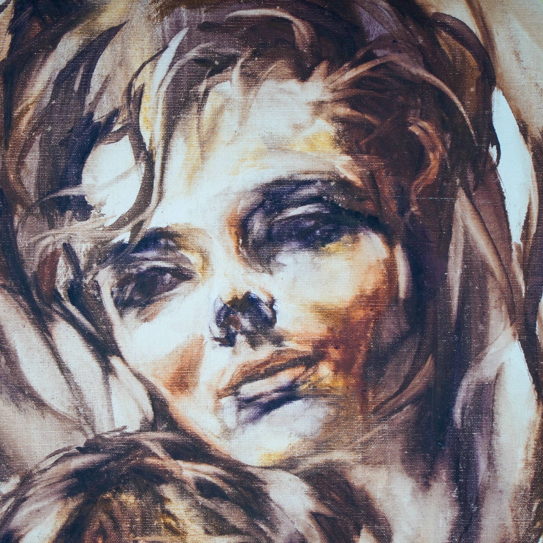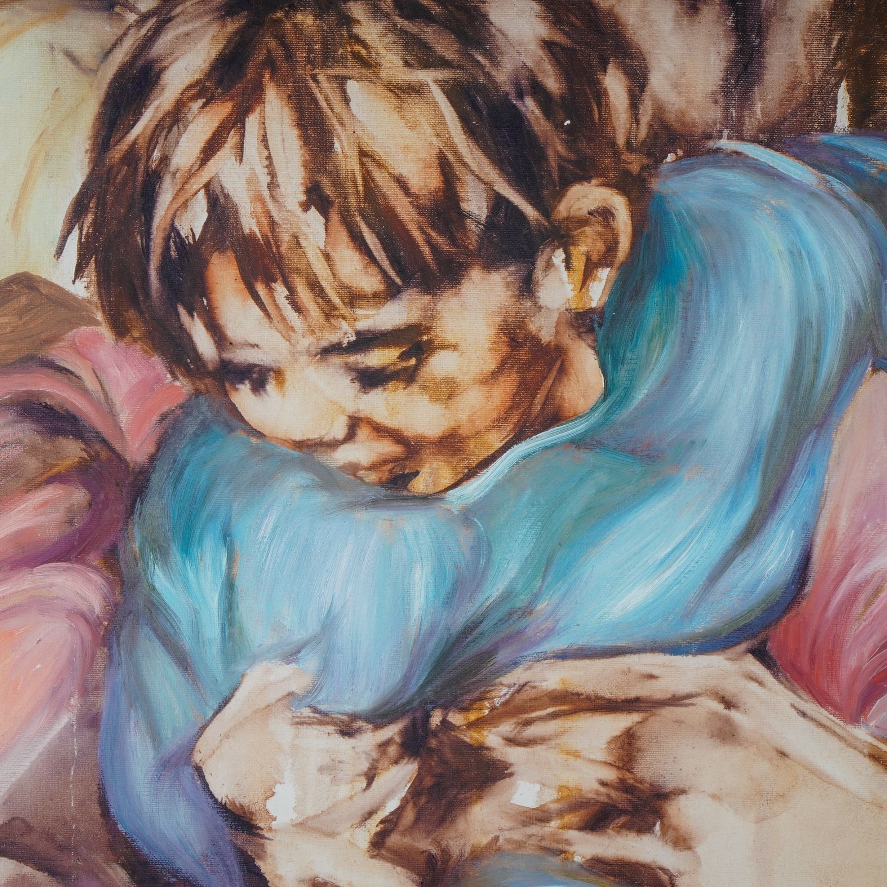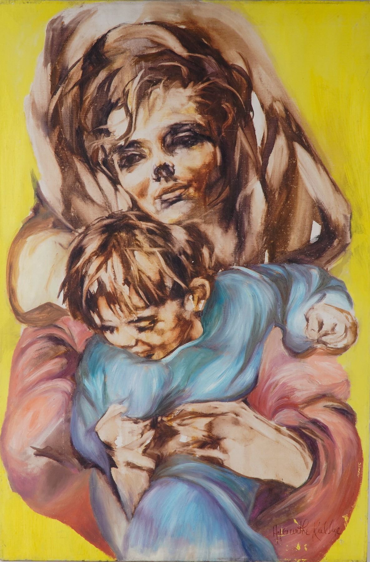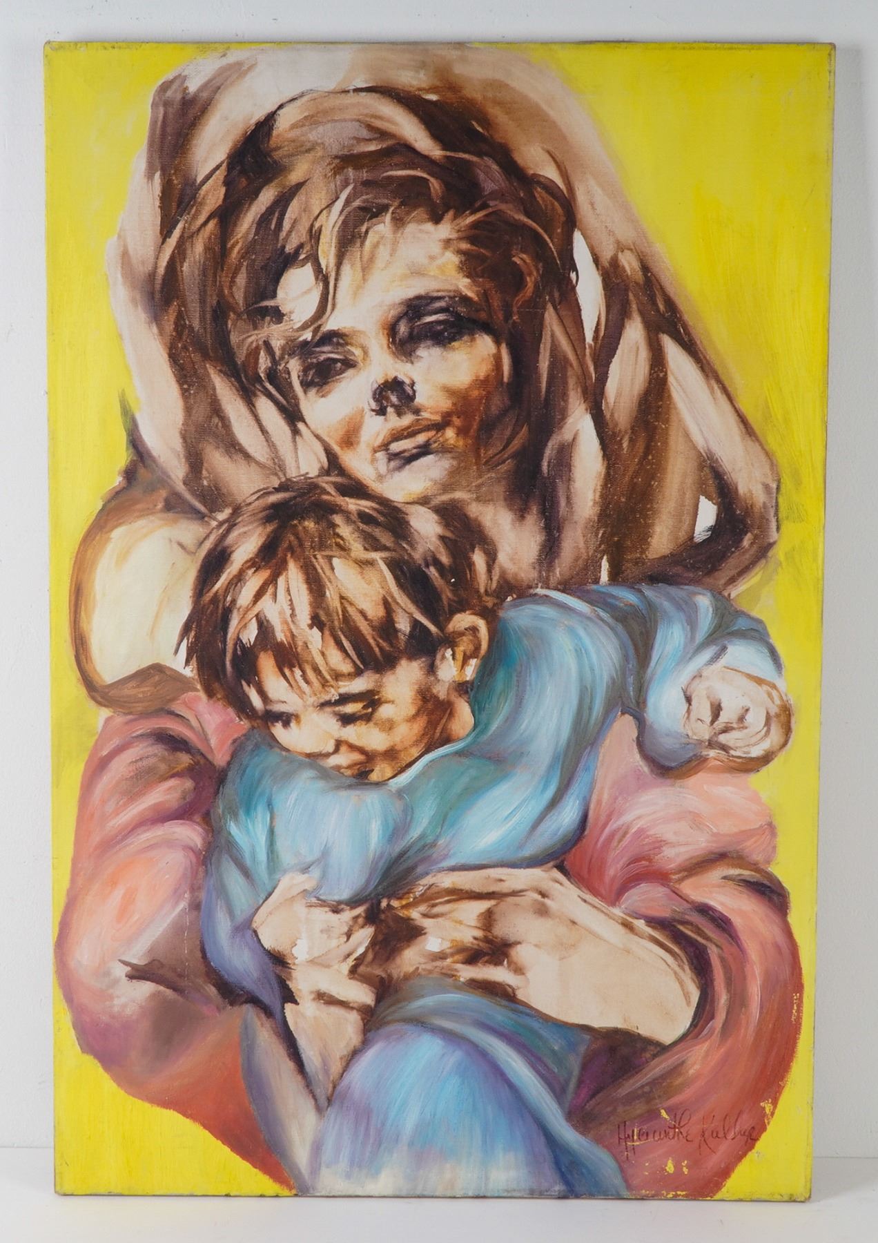 A moving and expressive composition by celebrated American artist Hyacinthe Kuller Baron, known for her vibrant, emotive portraits and figurative works. This oil on canvas depicts a tender mother and child rendered in Baron's signature style, bold brushwork, warm earth tones, and expressive linework that capture deep emotional resonance. The figures emerge from a bright yellow ground, emphasizing the luminous intimacy of the embrace. Baron's works, which have been exhibited internationally and collected by major institutions, reflect a lifelong exploration of human connection, femininity, and spiritual warmth. Signed lower right Hyacinthe Kuller.