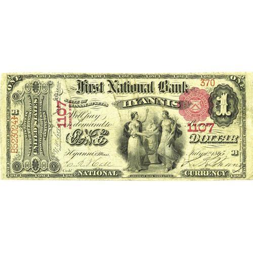 <B>Hyannis, MA</B></I> - $1 1875 Fr. 386 <B>The First NB</B></I> Ch. # 1107<BR>A well margined and bright for the grade Series 1875 ace from a much sought after Cape Cod bank. A bit of graffiti on the back affects nothing and is mentioned solely for total accuracy in cataloguing. With interest in better Massachusetts notes, particularly from the eastern half of the state at record levels, expect to see this decent <B>Fine+</B></I> example reach or exceed...<BR><I>From The Plymouth Rock Collection</B></I>