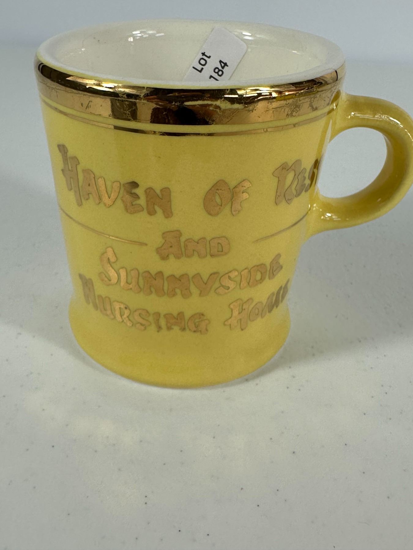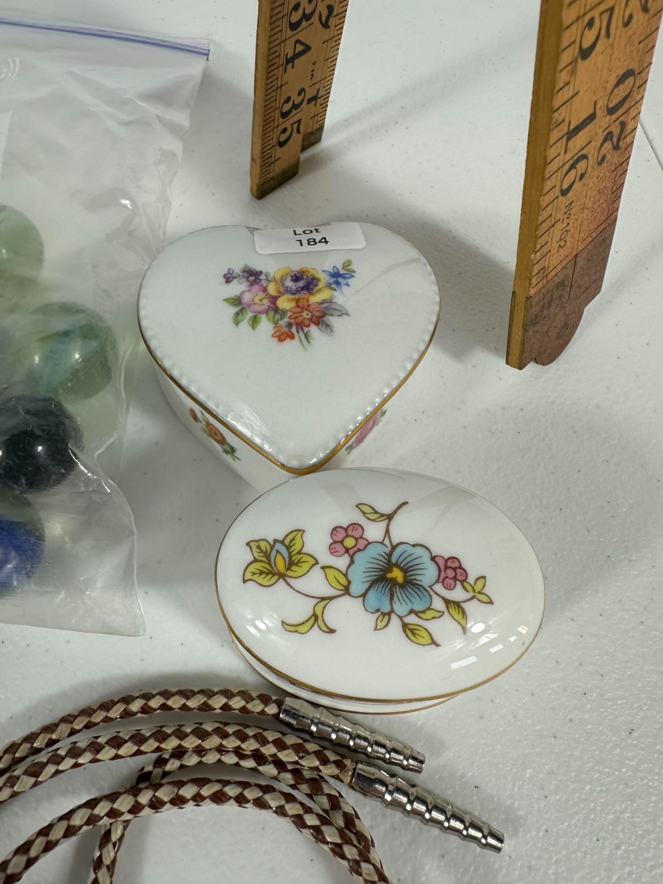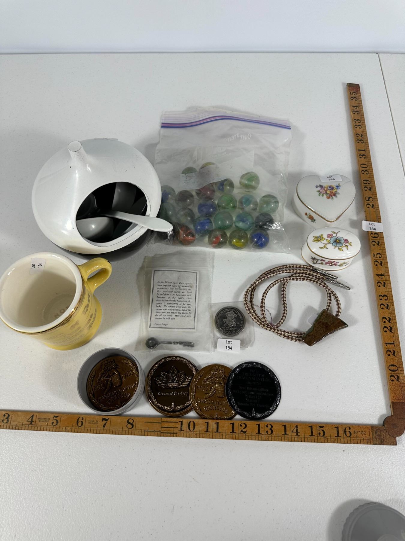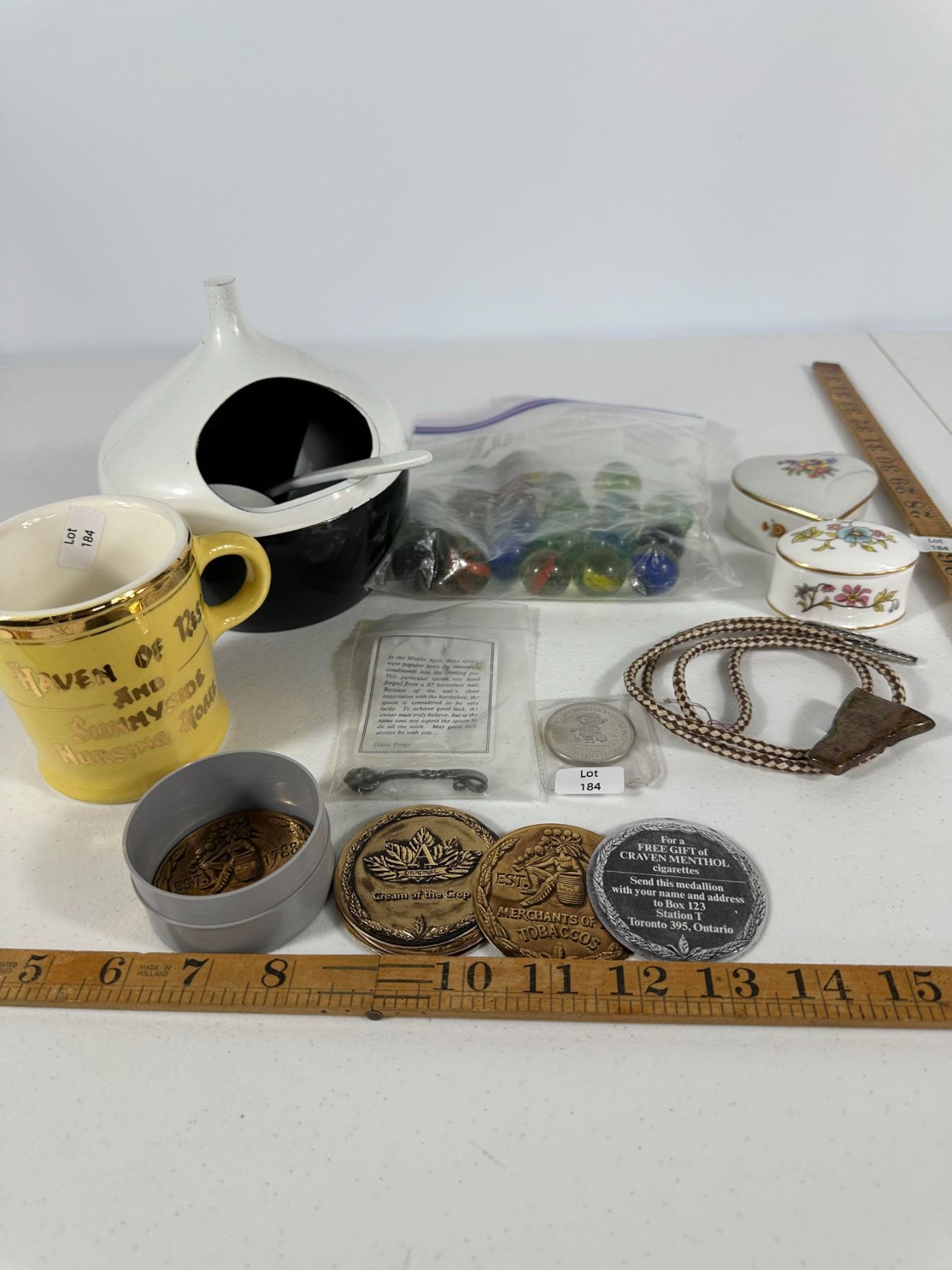 Includes Hycroft pottery advertising mug 'Haven of Rest and Sunnyside Nursing Home,' Craven cigarette promotional medallions, vintage marbles, porcelain trinket boxes, and black/white ceramic sugar dish.