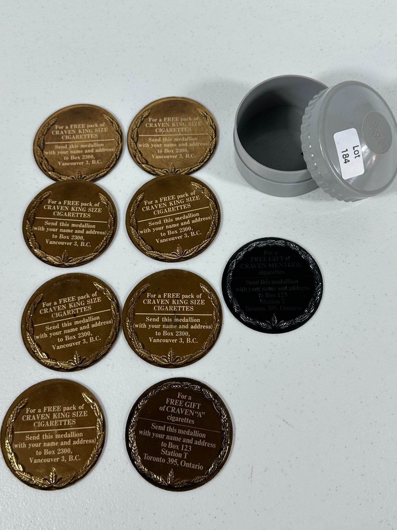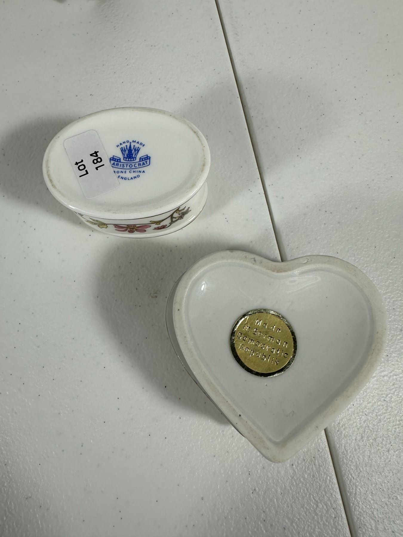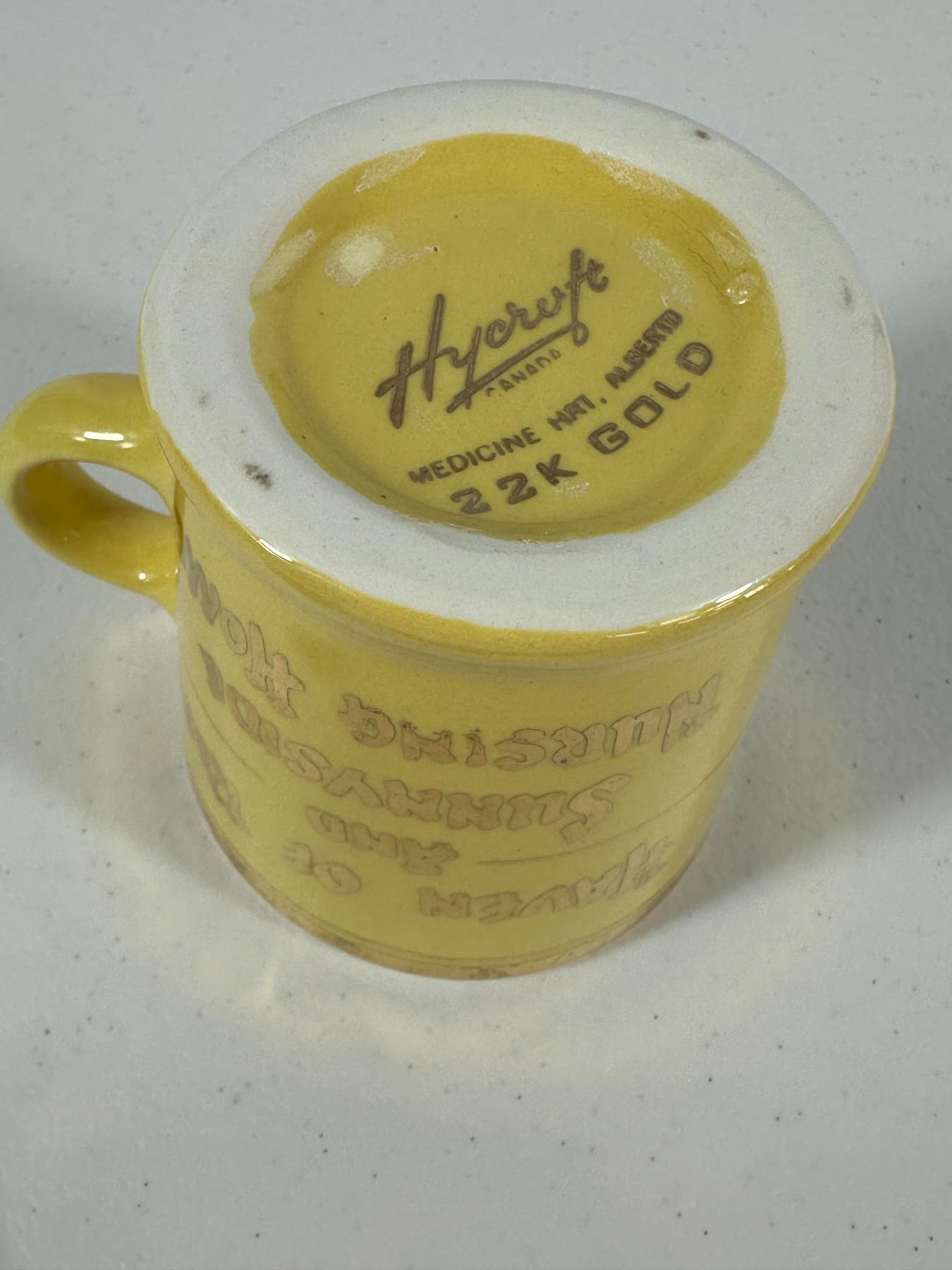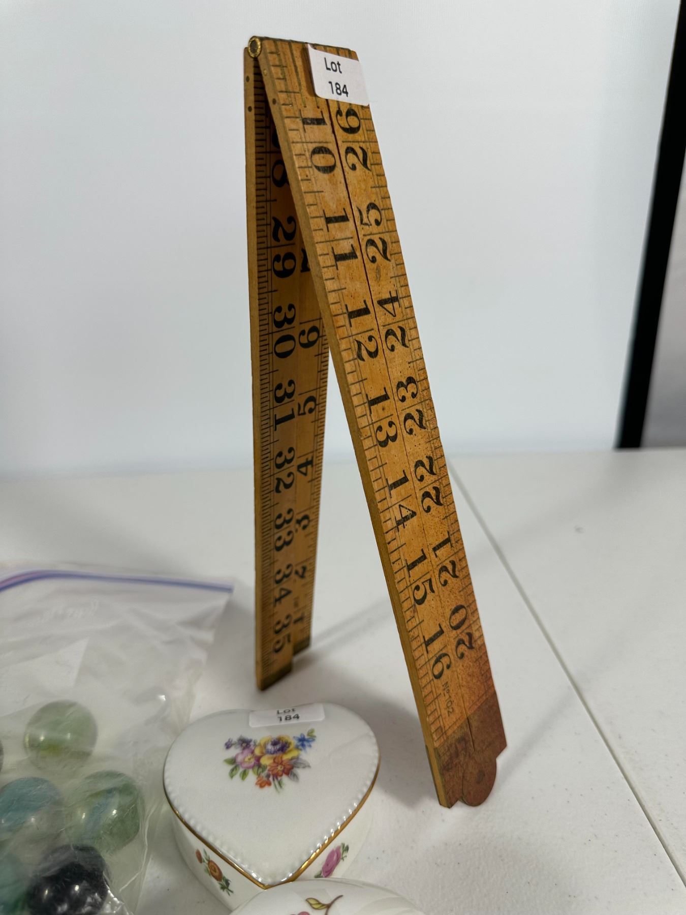 Includes Hycroft pottery advertising mug 'Haven of Rest and Sunnyside Nursing Home,' Craven cigarette promotional medallions, vintage marbles, porcelain trinket boxes, and black/white ceramic sugar dish.