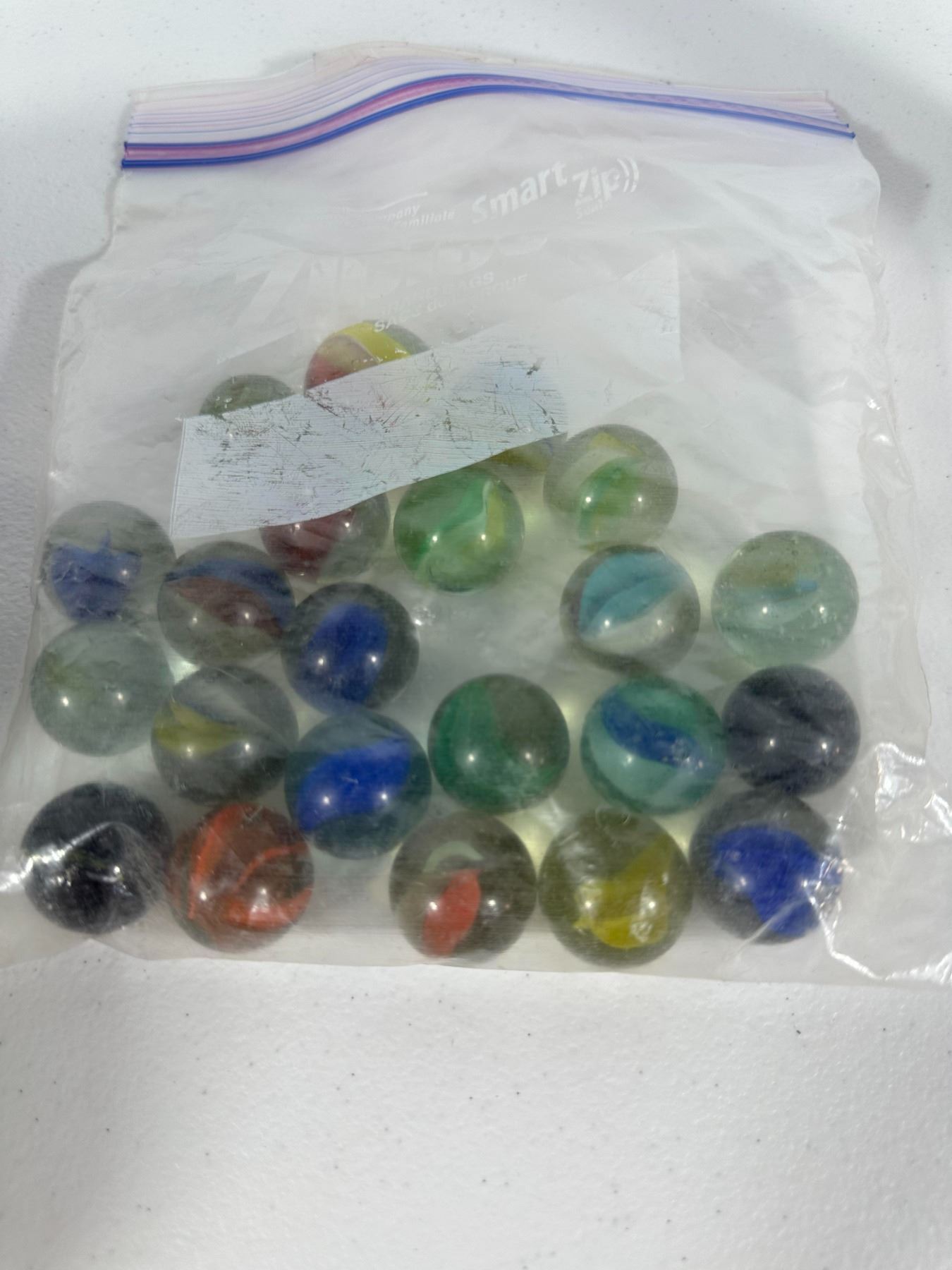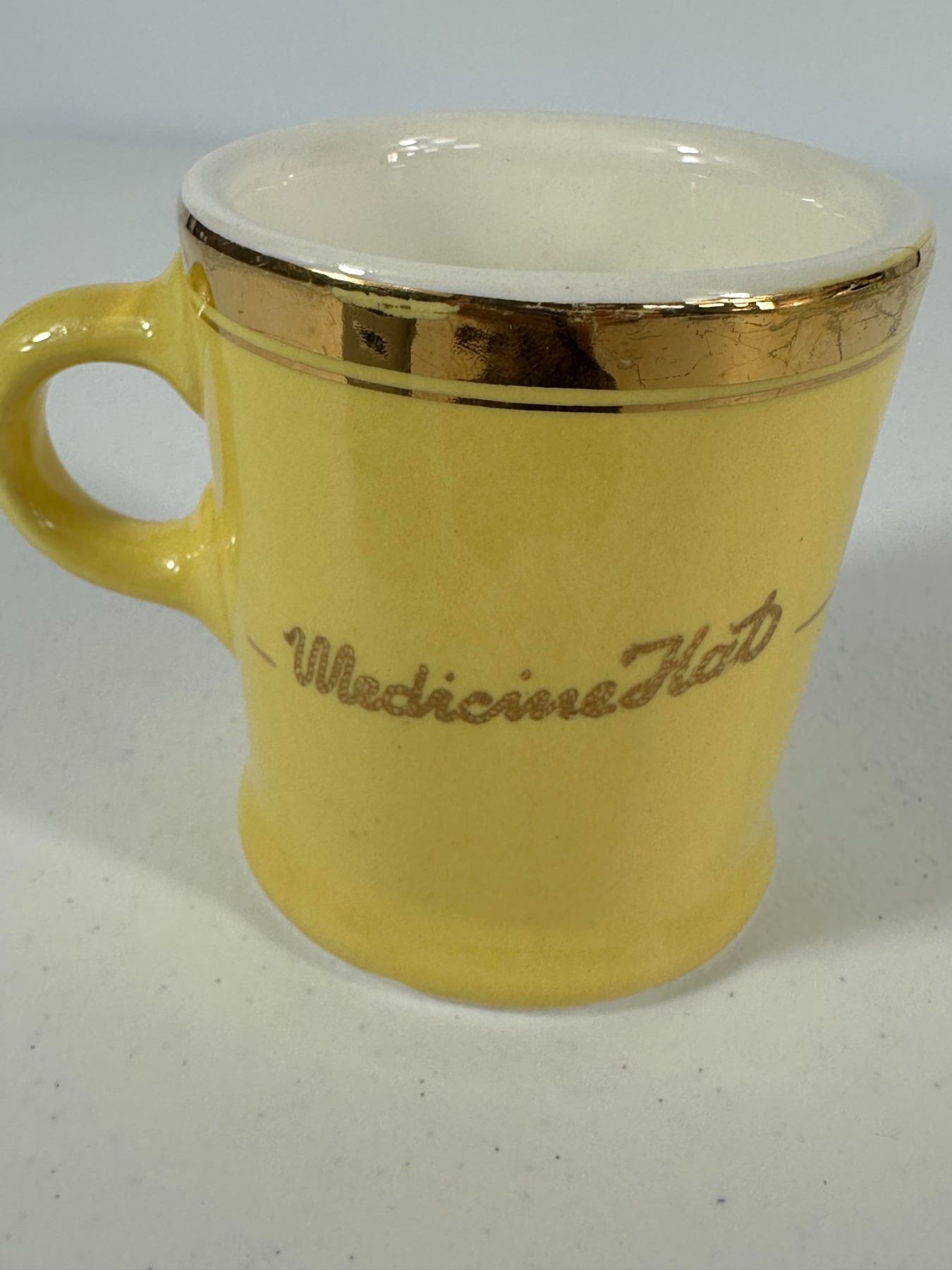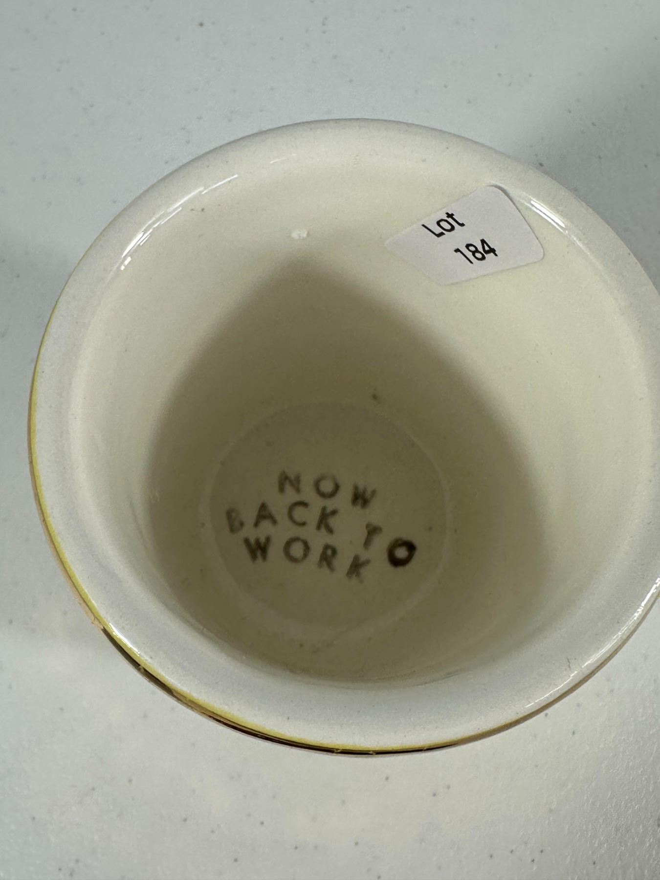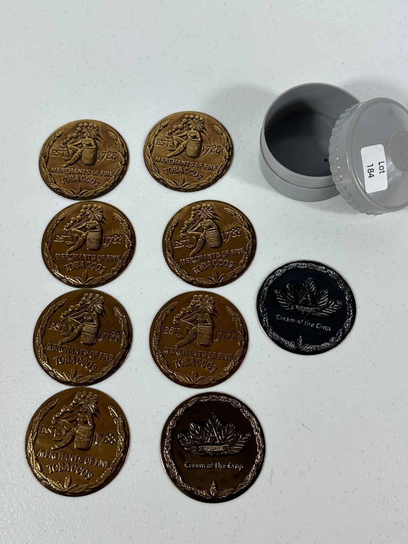 Includes Hycroft pottery advertising mug 'Haven of Rest and Sunnyside Nursing Home,' Craven cigarette promotional medallions, vintage marbles, porcelain trinket boxes, and black/white ceramic sugar dish.