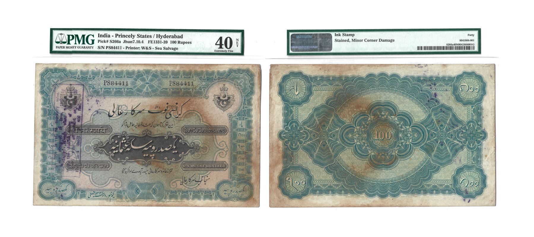 Hyderabad, 100 rupees, 1st issue, FE 1331-39, unsigned, serial no.: PS84411, Amardad, 'Sign 1' type, Promise text in three lines in Urdu, printed by Waterlow & Sons, London,Sea Salvage, (J&R 7.10.4),PMG Graded by PMG 40 Extremely Fine NET.