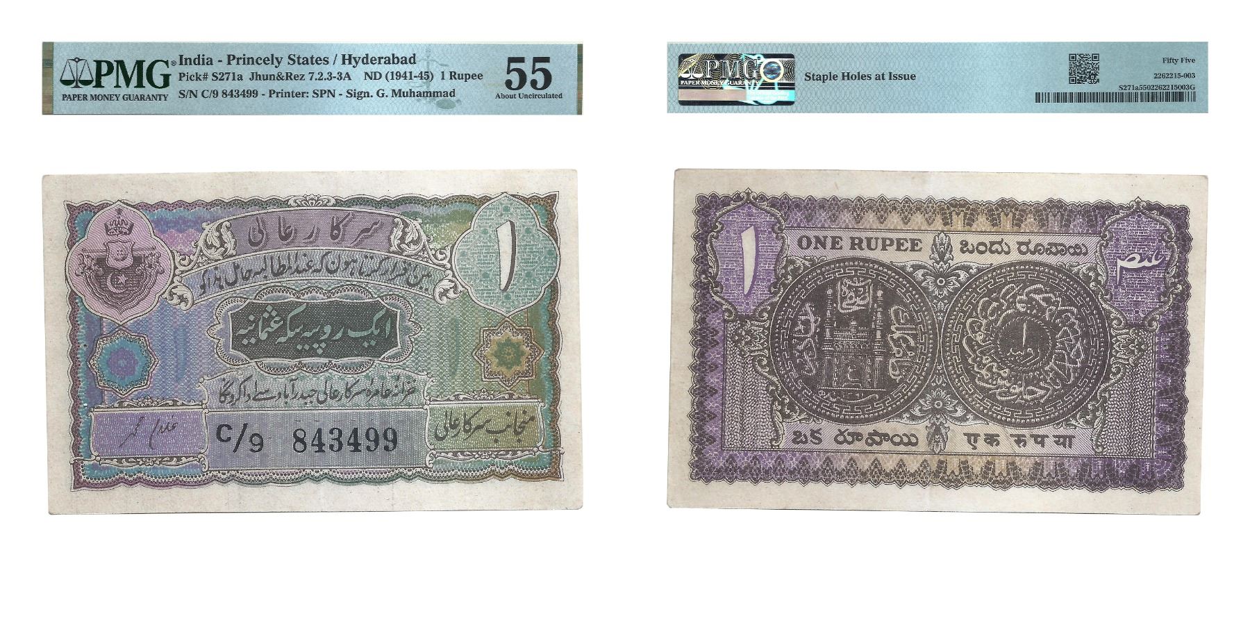 Hyderabad Government , 1 Rupee, ND (1941-45), serial number C/9 843499, Ghulam Muhammad signature, (KJ & amp; RR # 7.2.3), in PMG holder 55, choice About Uncirculated,high grade for this type, scarce.