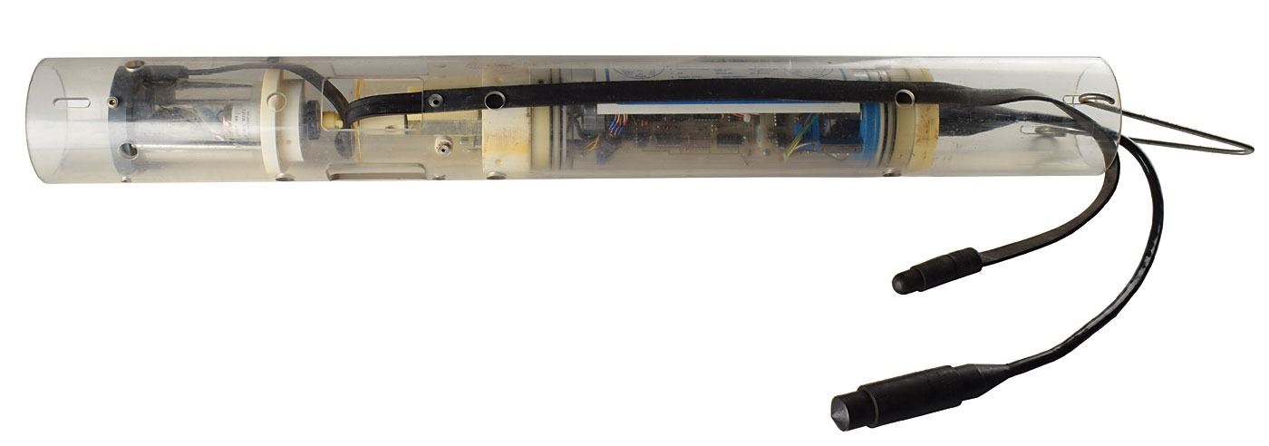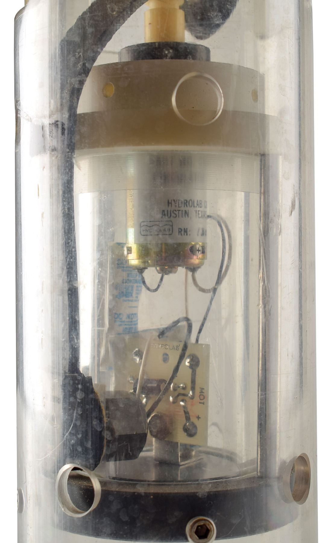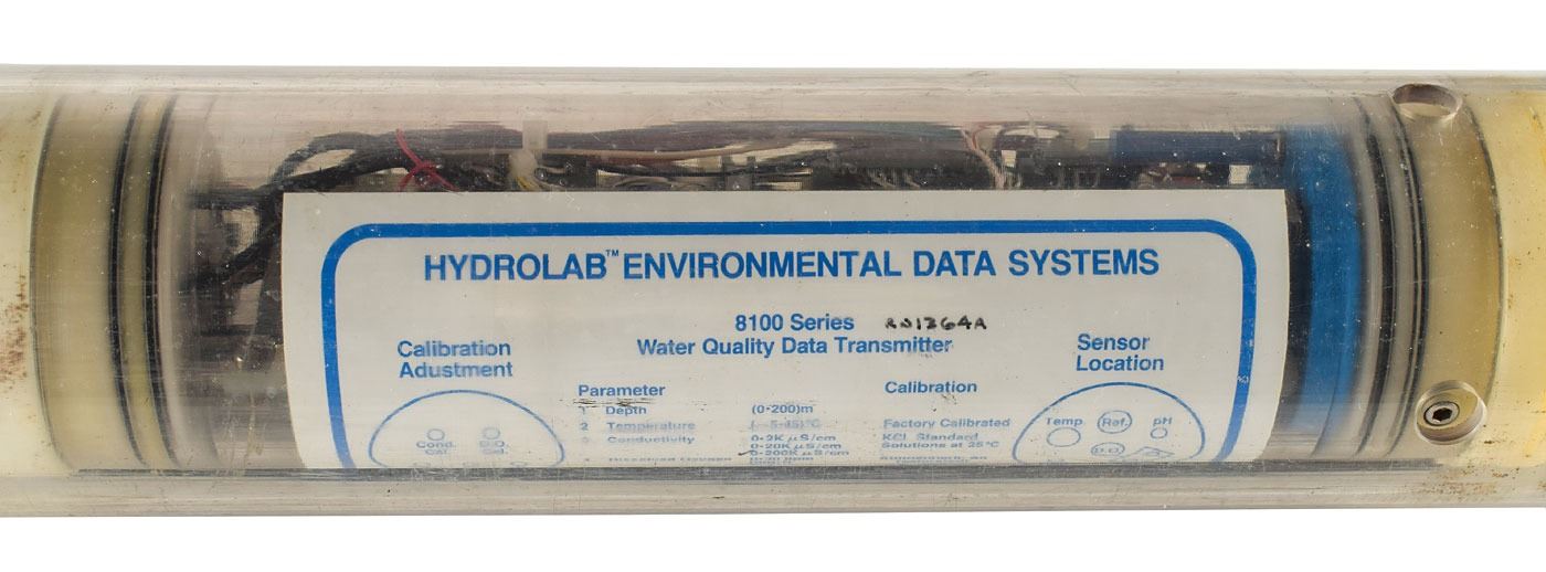 Hydrolab Environmental Data Systems 8100 Series water quality data transmitter, measuring 31˝ long and 3.75˝ in diameter, comprising a clear plastic tube containing an electronic sensing package. In very good to fine condition.