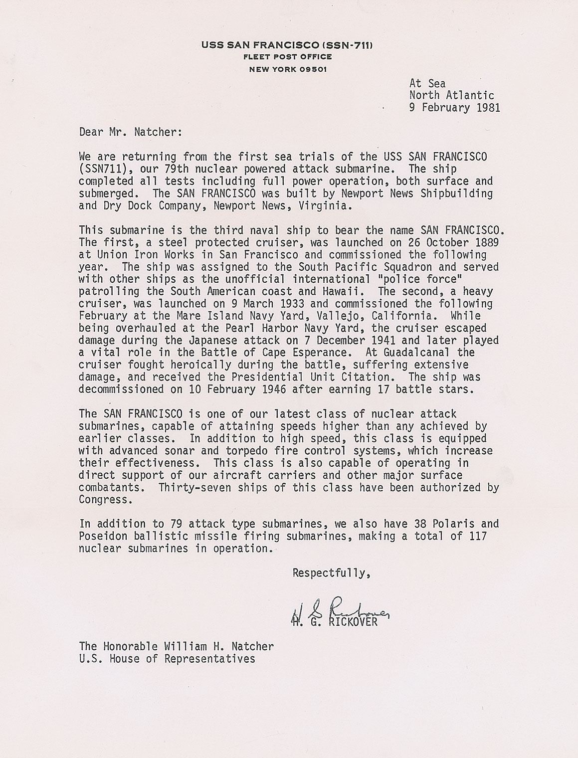 TLS signed “H. G. Rickover,” one page, 8 x 10.5, USS San Francisco letterhead, February 9, 1981. Letter to the Hon. William H. Natcher, who represented Kentucky in the House of Representatives from 1953 to 1994. In part: "We are returning from the first sea trials of the USS San Francisco (SSN711), our 79th nuclear powered attack submarine. The ship completed all tests including full power operation, both surface and submerged…This submarine is the third naval ship to bear the name San Francisco. The first, a steel protected cruiser, was launched on 26 October 1889 at Union Iron Works…The ship was assigned to the South Pacific Squadron and served with other ships as the unofficial international 'police force' patrolling the South American coast and Hawaii. The second, a heavy cruiser, was launched on 9 March 1933 and commissioned the following February…While being overhauled at the Pearl Harbor Navy Yard, the cruiser escaped damage during the Japanese attack on 7 December 1941 and later played a vital role in the Battle of Cape Esperance. At Guadalcanal the cruiser fought heroically during the battle, suffering extensive damage, and received the Presidential Unit Citation. The ship was decommissioned on 10 February 1946 after earning 17 battle stars. The San Francisco is one of our latest class of nuclear attack submarines, capable of attaining speeds higher than any achieved by earlier classes. In addition to high speed, this class is equipped with advanced sonar and torpedo fire control systems, which increase their effectiveness. This class is also capable of operating in direct support of our aircraft carriers and other major surface combatants. Thirty-seven ships of this class have been authorized by Congress. In addition to 79 attack type submarines, we also have 38 Polaris and Poseidon ballistic missile firing submarines, making a total of 117 nuclear submarines in operation." In fine condition.