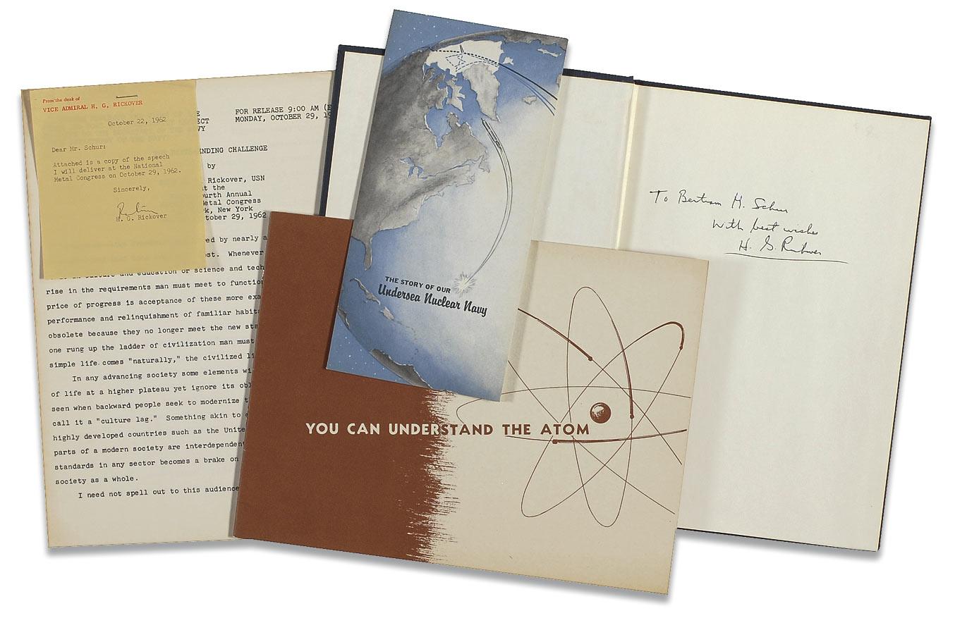 Signed book: How the Battleship Maine was Destroyed, Hardcover: 7 x 10, Department of the Navy: 1976, 171 pages. Signed and inscribed on the first free end page, “To Bertram H. Schur, With best wishes, H. G. Rickover”; a TNS, signed, “Rickover,” one page, 3.75 X 4.25, on gold memo paper printed in red, “From the desk of Vice Admiral H. G. Rickover,” dated October 22, 1962. Addressed to Mr. Schur, note reads, “Attached is the copy of the speech I will deliver at the National Metal Congress on October 29, 1962.” Note is stapled to a 25-page typewritten speech titled “The Never-Ending Challenge,” dated, “For Release 9:00 am (EST) Monday, October 29, 1962.” Also included are two brochures: “The Story of Our Undersea Nuclear Navy,” 8 pages, 4 X 8.2”, published and printed by General Dynamics Corporation; and “You Can Understand the Atom,” 22 pages, 10 X 7.5, published by the U. S. Government Printing Office: 1951. In fine overall condition. Pre-certified PSA/DNA and RRAuction COA.