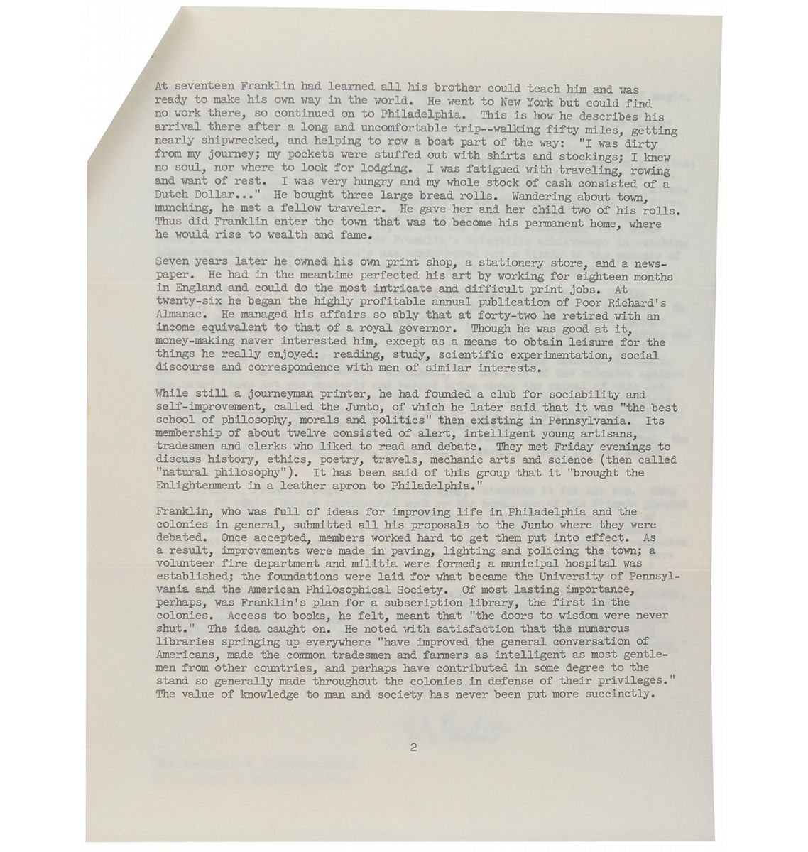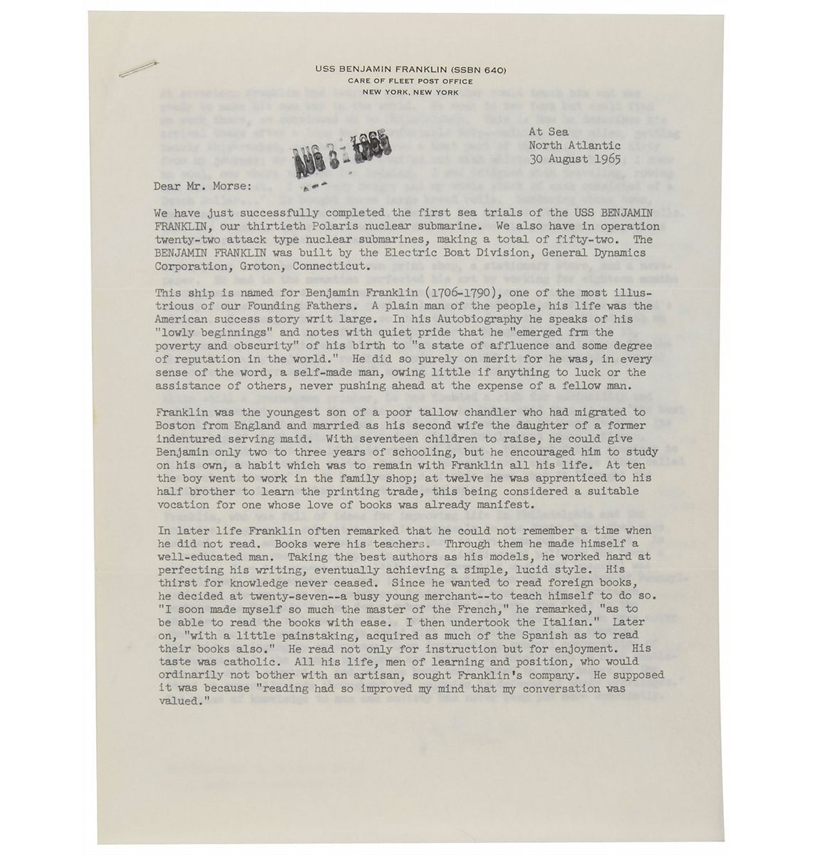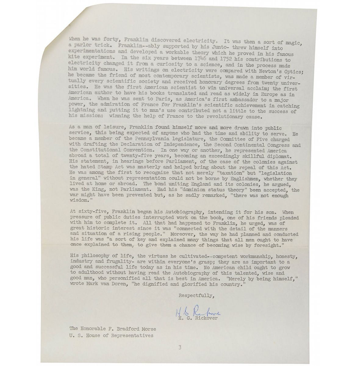 TLS signed “H. G. Rickover,” one page, 8 x 10.5, USS Benjamin Franklin letterhead, August 30, 1965. Letter to Congressman F. Bradford Morse. In part: “We have just successfully completed the first sea trials of the USS Benjamin Franklin, our thirtieth Polaris nuclear submarine. We also have in operation twenty-two attack type nuclear submarines, making a total of fifty-two.” He goes on to provide a lengthy biography of Franklin. In fine condition.