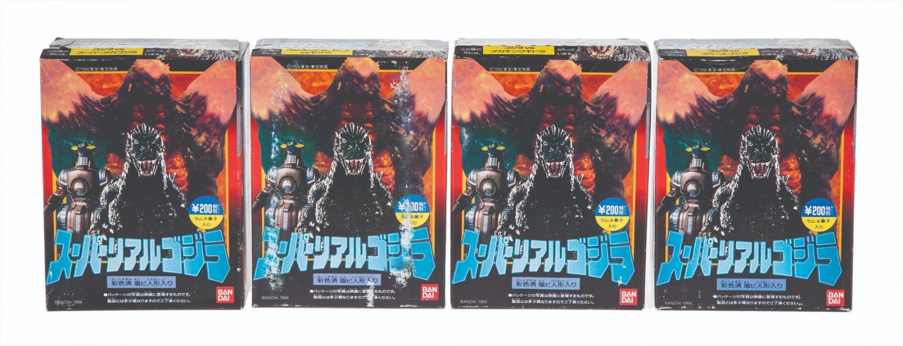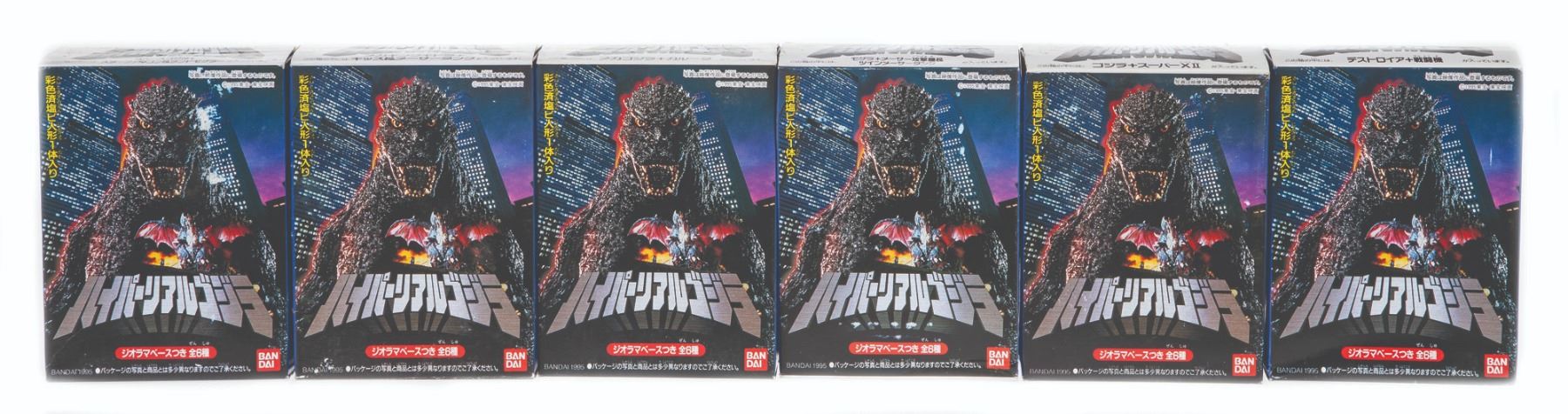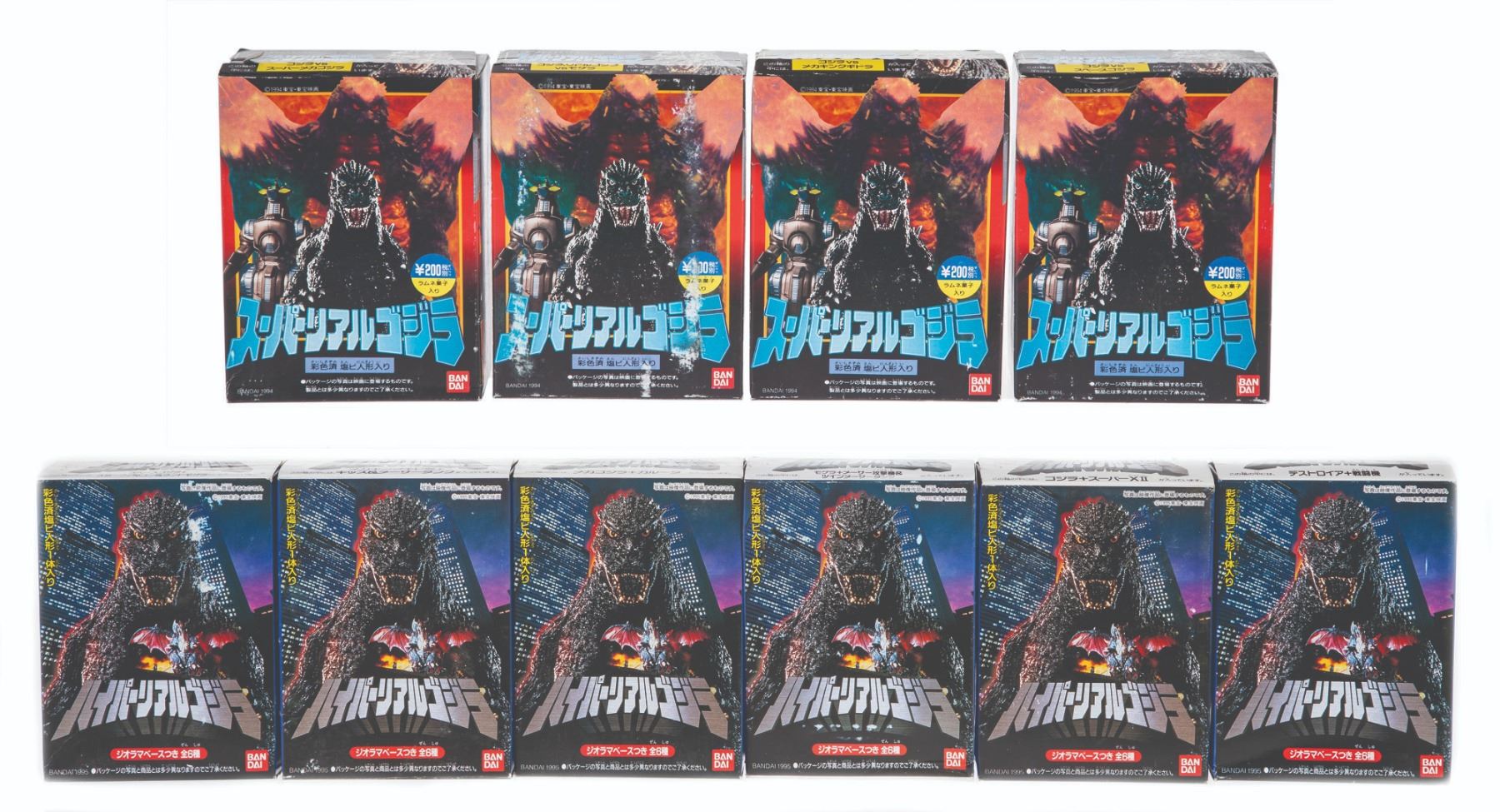 1994/1995. Bandai Hyper Real Godzilla Set of 6 Boxed Figures/Bandai Super Real Godzilla 4 Box Set of 9 Figures. Super Figures: 2” Hyper Figures: 3”. VG+.