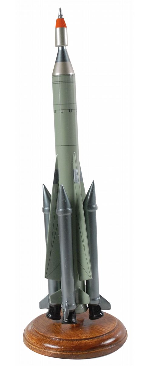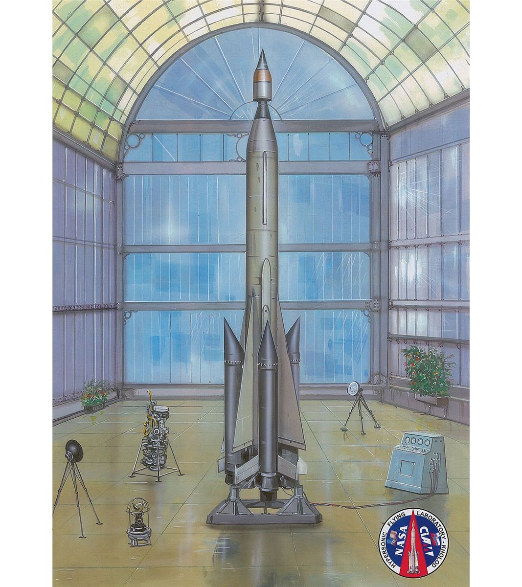 Very neat one-piece composite model of the Russian KHOLOD hypersonic flying laboratory model. This 1991 Soviet school model measures 16? high, has its four solid rocket boosters, and comes with its display stand. In fine condition. Accompanied by two color 11.75 x 16.5 color posters of an artist’s rendition of the craft in a laboratory.