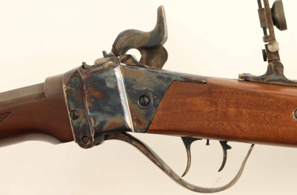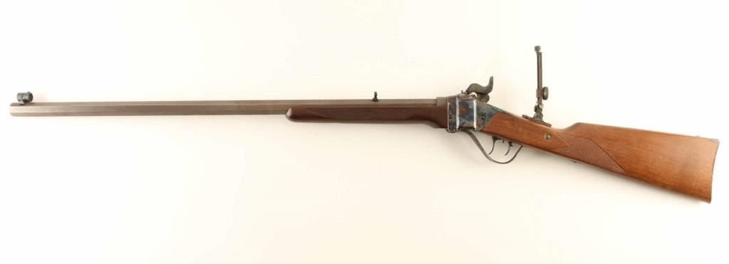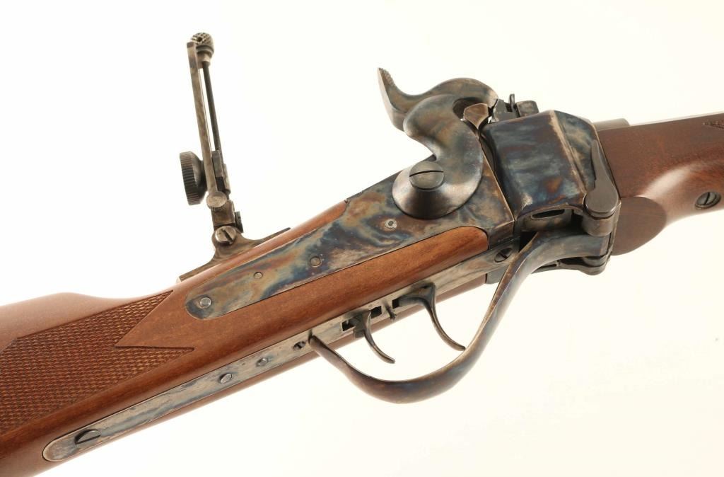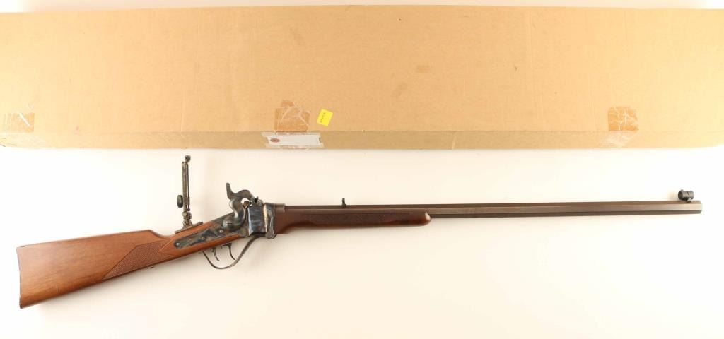 Rifle, Single-shot. Breech Block action. Italian made (Industria Armi Bresicane) copy of the classic Sharps long rifle, popular with Buffalo hunters of the old west. 29 3/4" octagonal barrel. Hooded front peep sight. , and an adjustable, flip-up leaf sight. Anodized brown finish on the barrel. Case-hardened receiver, hammer, triggerguard, and butt plate. Smooth straight grip checkered walnut stock, and forearm. Checkered hammer, smooth trigger. Smooth steel butt plate. Triggerguard action lever. firing pin safety. Double set triggers. Import marks on barrel, and Italian proofed. Adjustable peep sight on the tang. Bore appears excellent/bright, but a little dirty. Metal finish is excellent, with a couple of very minor scratches. Wood is excellent with a few very minor scratches/rubs. Action is crisp/tight. Comes in the original fitted shipping box. NRA Condition-Near Excellent. Modern Firearm.