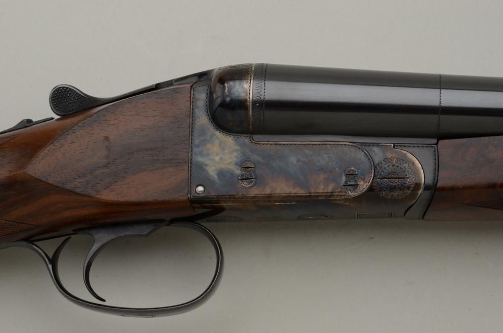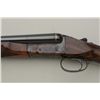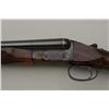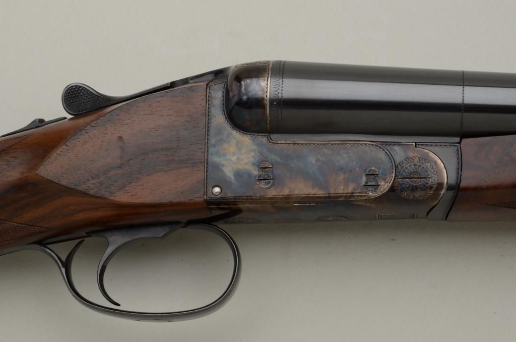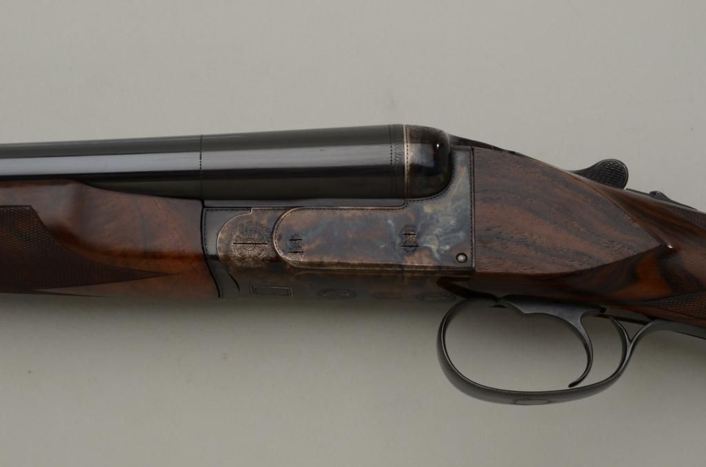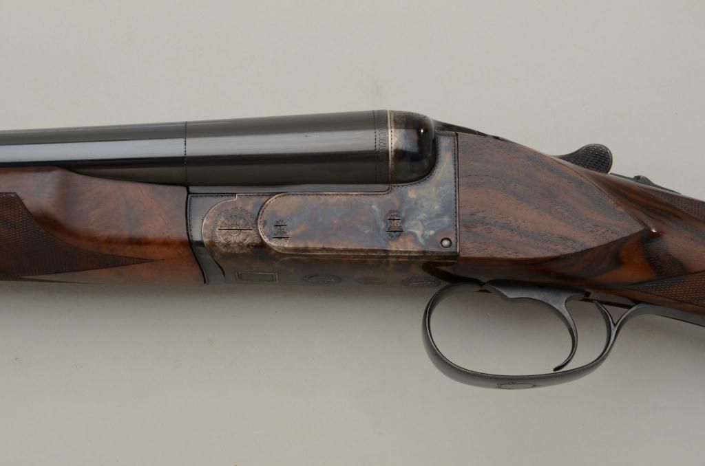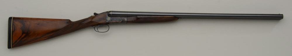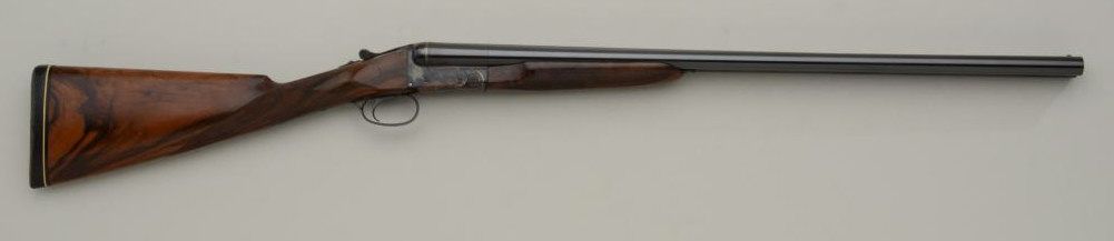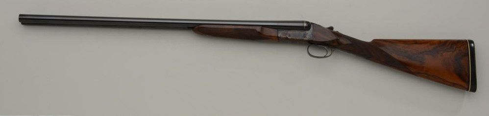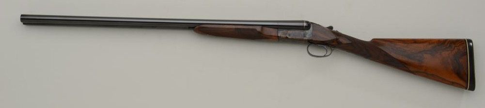 I.A.B.-Puccinelli box lock side-by-side double shotgun in 12 gauge with automatic ejectors, 28 inch barrels and blue and case hardened finish, straight grip and beaver tail forend. Serial number 13211. The gunremains in fine original condition showing 97% tO 99% original blue and case hardening. The stocks are very good plus to near fine with a couple of minor marks and slight evidence of use and handling. The barrels are gold inlaid with maker’s name. The rib is a low rise hand filed style. The frame is lightly border engraved . The select burl stock measures 14 ½ to the end of the pad and 14 inches to the end of the wood. The rightbarrel is choked .10 for improved modified and the left barrel is choked .23 for improved cylinder and the wall thickness measures .21 in each barrel and the gun has seen little use. The stock shows a 1 3/4 inch drop at heel with 1 3/4 inch drop at the comb also. The stock is slightly cast off about ¼ inch at toe with no cast at heel. Puccinelli at one time was the associated with Perazzi Est. $1750-$3500