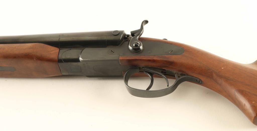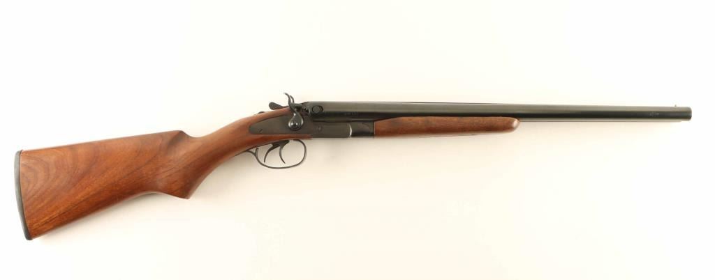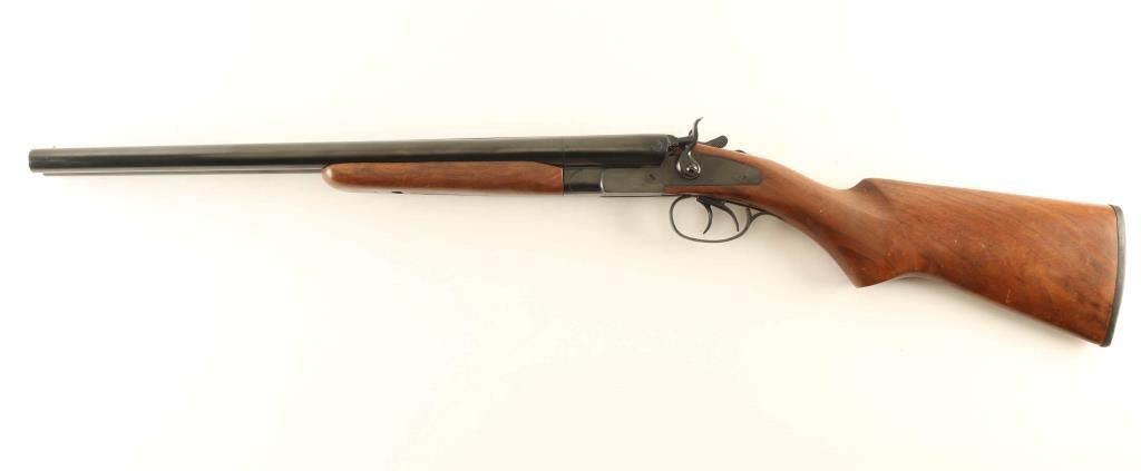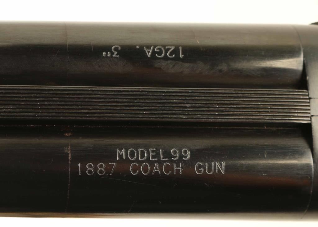 '1887Coach Gun' Side-by-side exposed hammer double barrel shotgun chambered for 2 3/4" & 3" 12 gauge shells, manufactured in China by S.D.2. Features a blued finish, 20" barrels with a raised serrated sighting rib, extractor, brass bead front sight, double triggers, knurled hammer spurs, knurled top lever, sliding tang safety, smooth walnut beavertail forend and pistol grip shoulder stock with smooth black rubber buttplate. Shotgun retains approximately 90% of its blued finish showing light wear and some scattered light surface rust. Action is sound, the bores are bright and the wood stocks are very good with minor blemishes. Condition is near NRA Very Good. ***Modern Firearm***