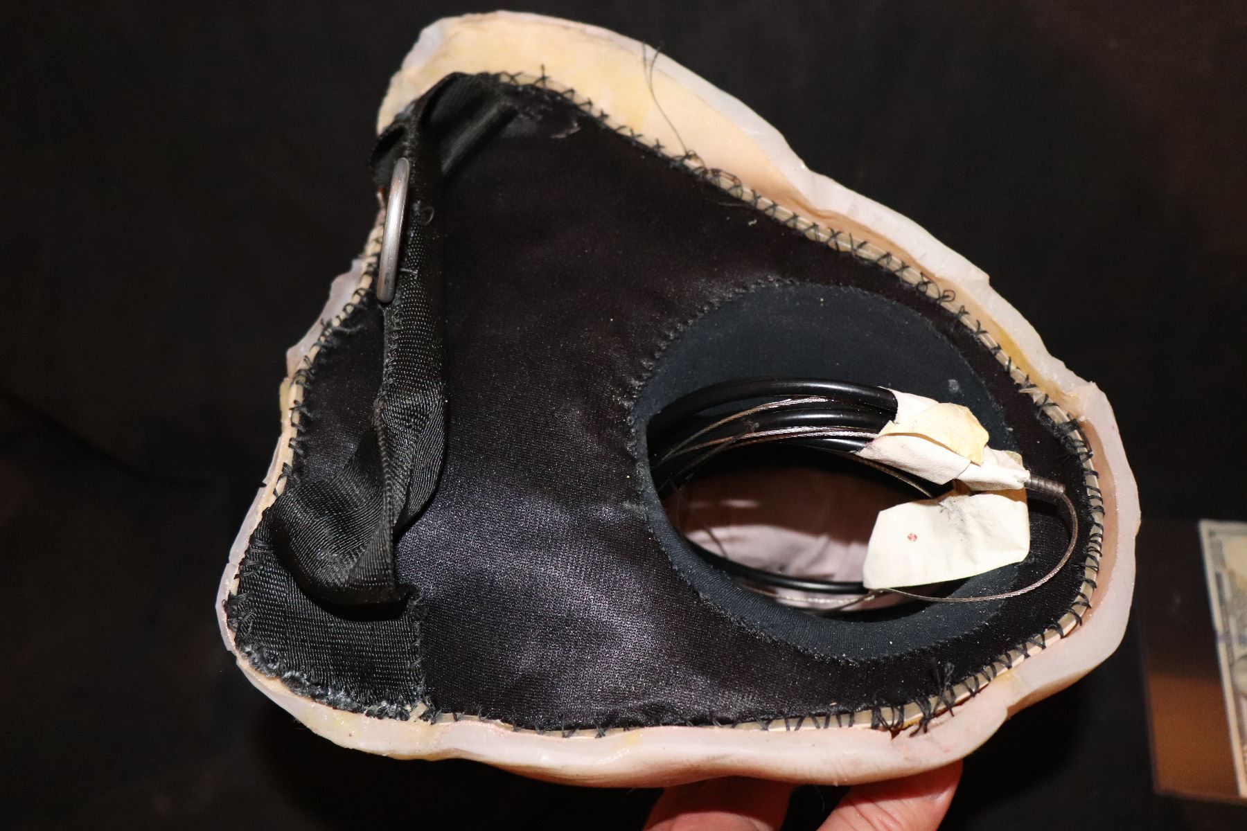 All silicone with acrylic eyes and teeth. Cables to operate are intact.