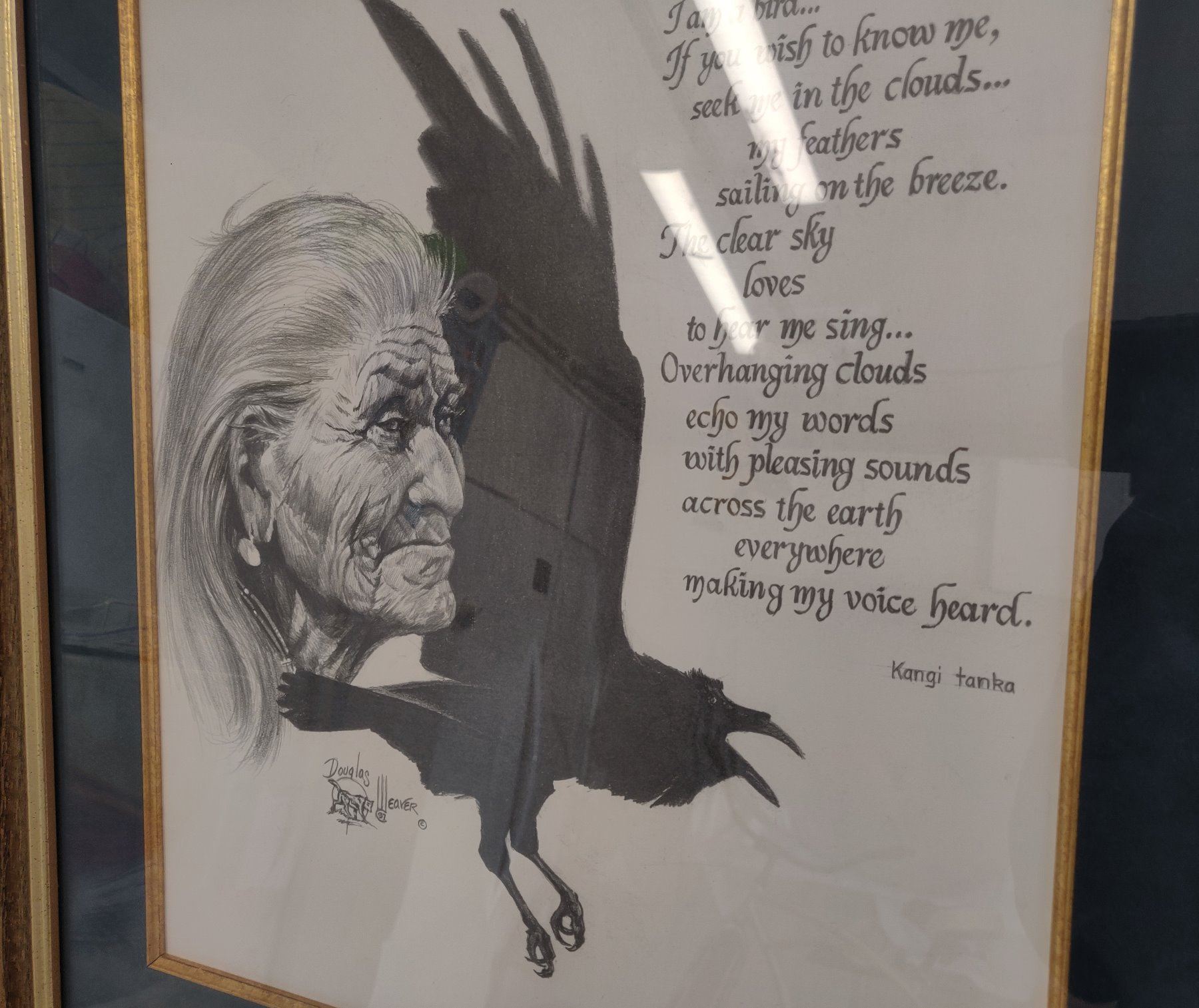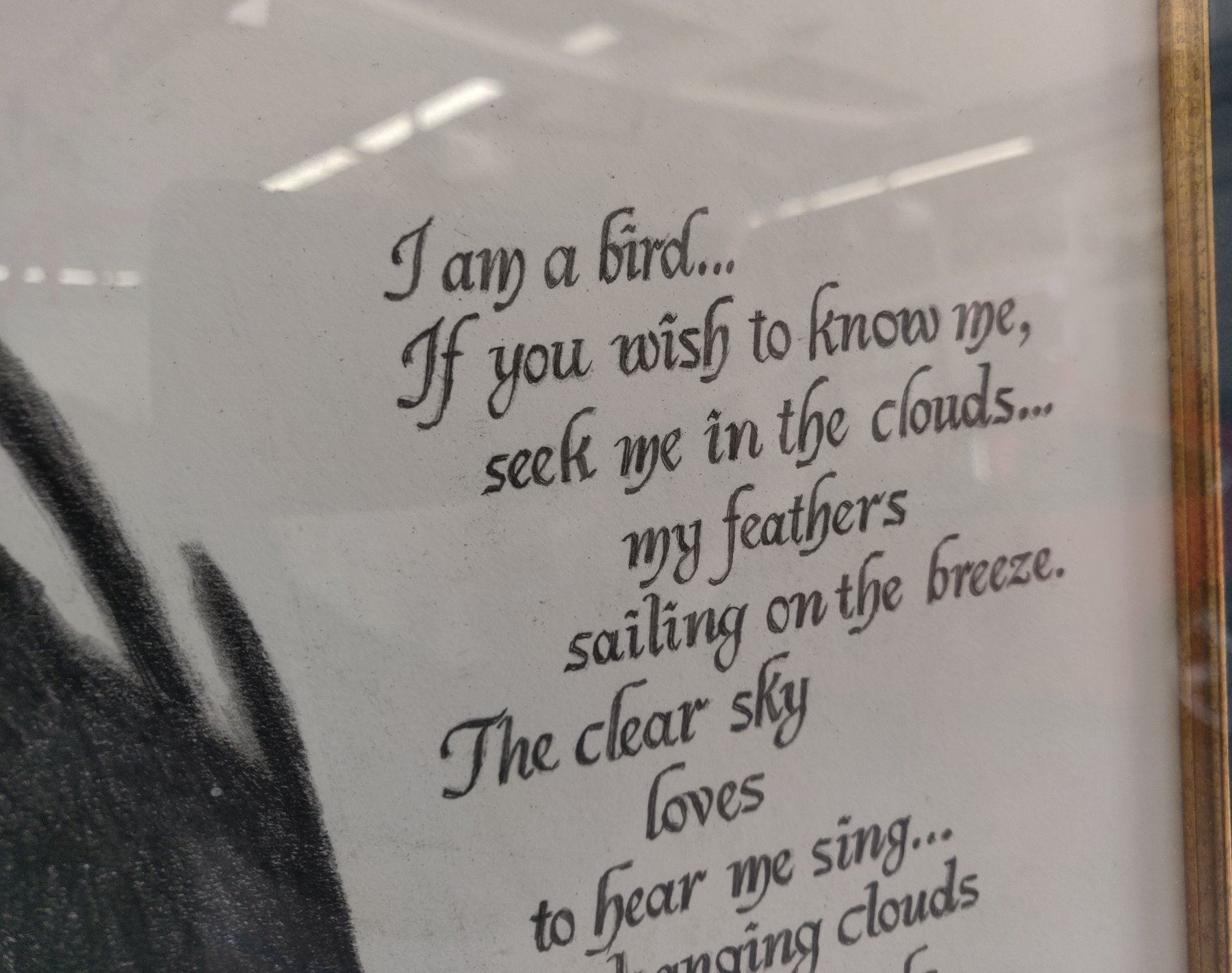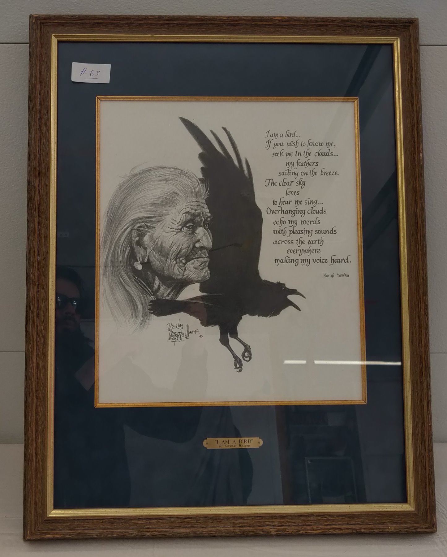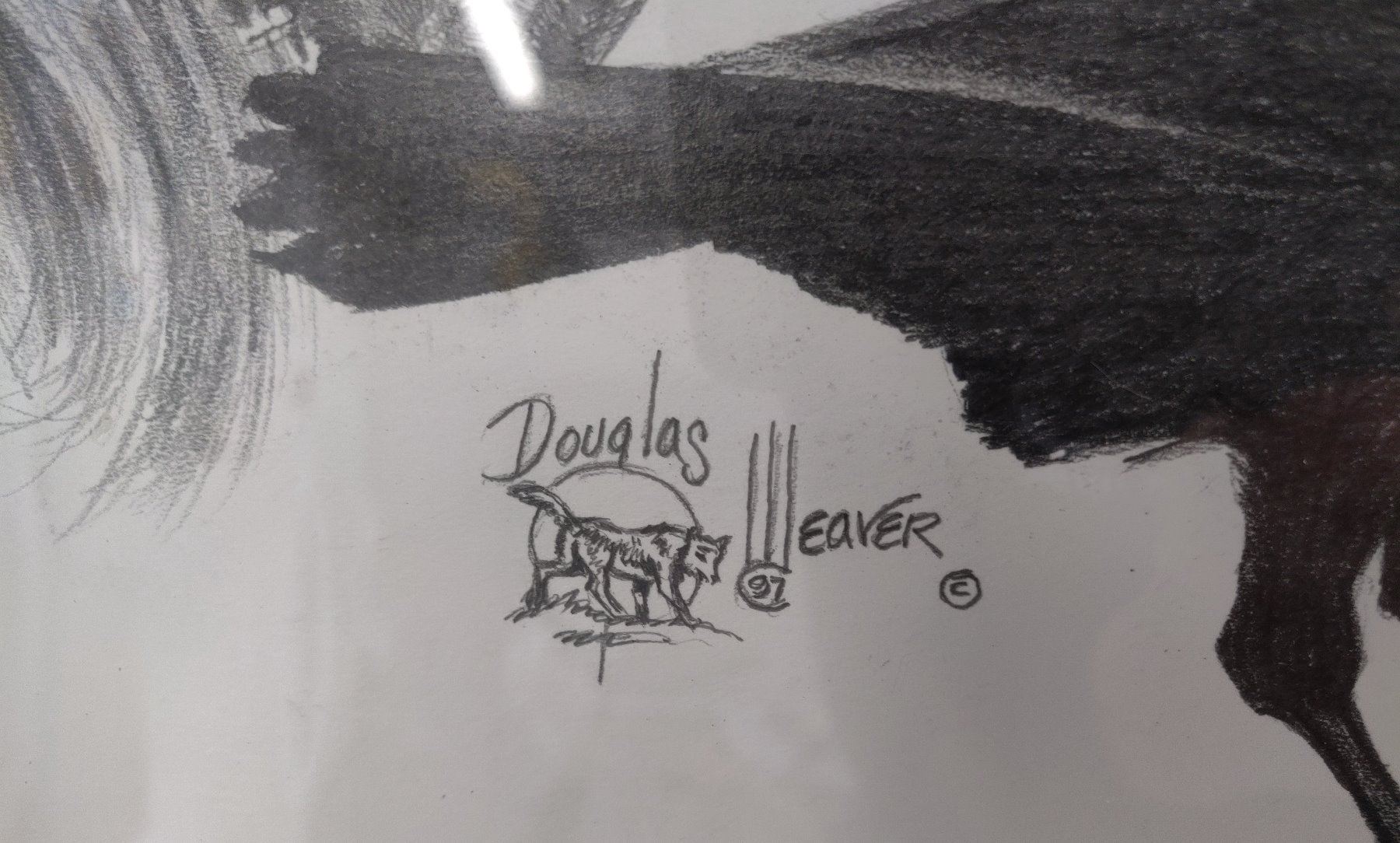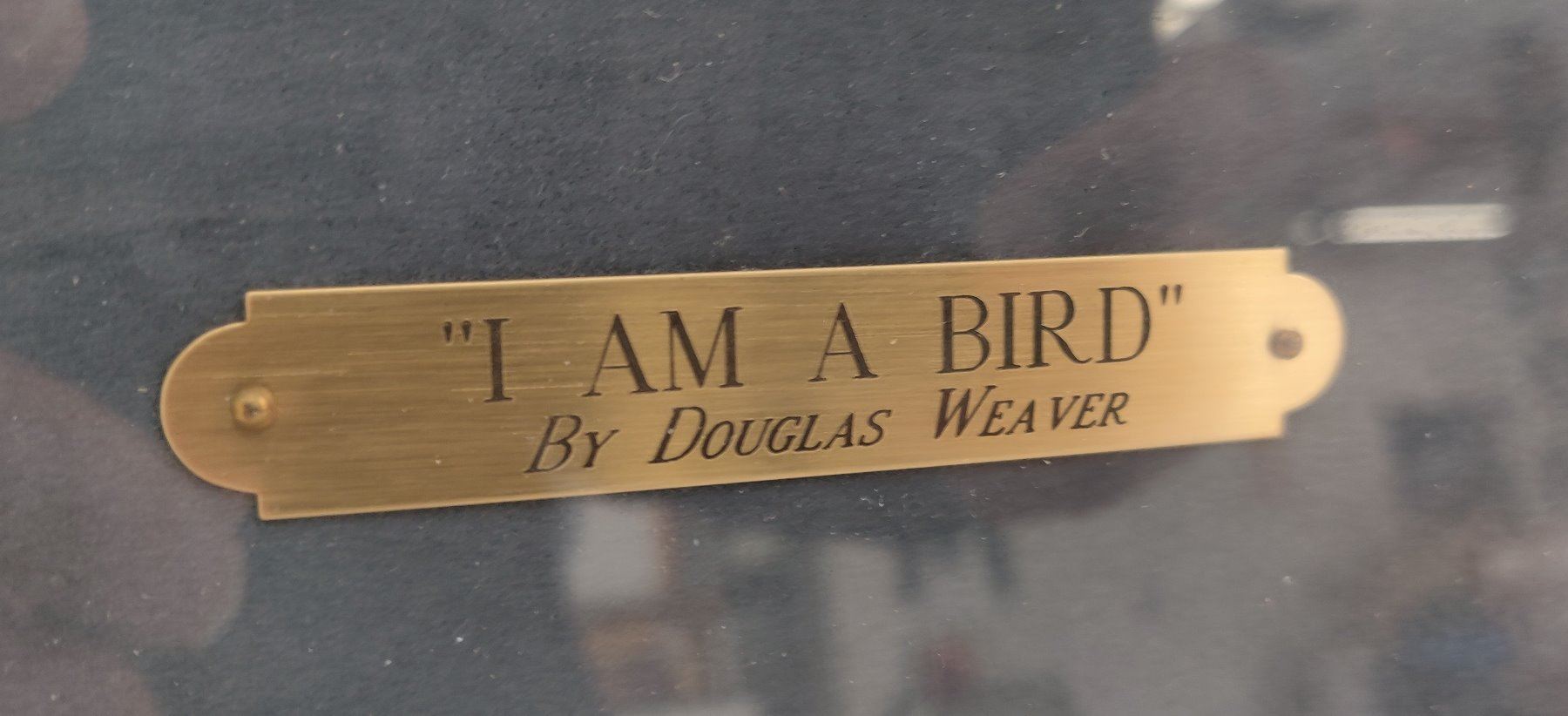 "I Am A Bird" Douglas Weaver Drawing, c. 1987. Made of wood frame, glass, pencil and possibly ink, the item measures 13 1/2" x 15 1/2". Douglas Weaver. Condition: Good, see images. Shipping: $65.00 USA estimate only, due to size, weight and insurance. Local pick-up preferred.