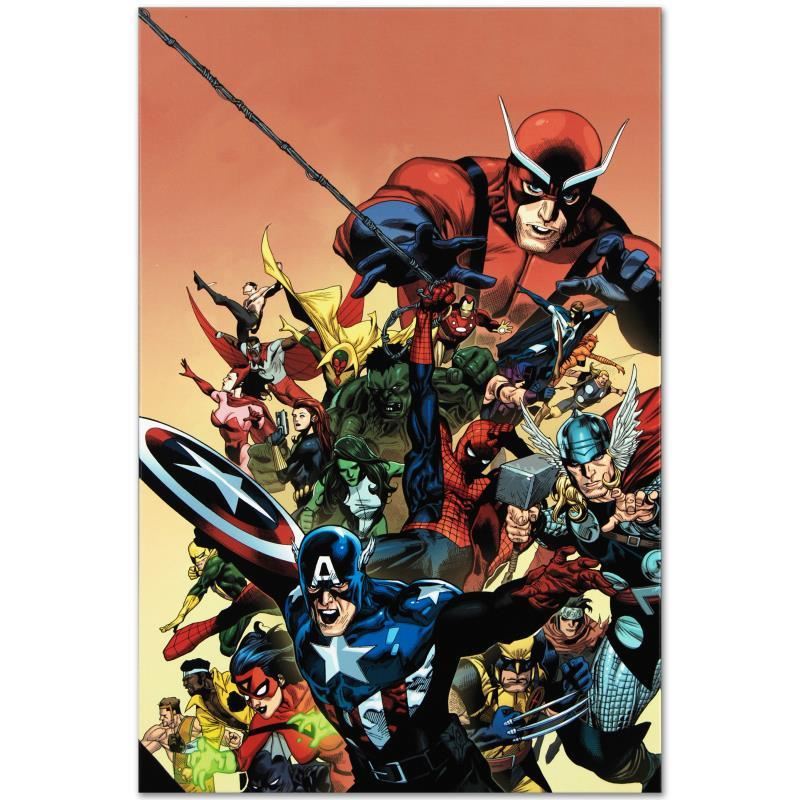 A piece of comic book history, this limited edition, from original art by Leinil Francis Yu, depicts Captain America, Spider-Man, Thor, Wolverine, Hulk, Ant-Man, She Hulk, Vision and Iron-Man, among many others. After winning the Wizard's Drawing Board Contest, Marvel Comics hired Leinil Francis Yu to work on the Wolverine series. After his run on Wolverine, he moved on to work on Marvel's core X-Men title in 2000. Yu continued to work on other Marvel titles such as Fantastic Four, Ultimate Wolverine vs. Hulk and New Avengers. "I Am An Avenger #1" is a limited edition numbered giclee on canvas by Leinil Francis Yu presented by Marvel Comics. This piece comes gallery wrapped. Includes Certificate of Authenticity! Measure approx. 18" x 27" (image). This item requires special handling and may have a longer than usual turnaround.