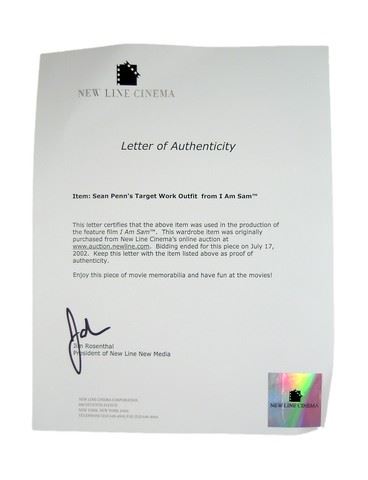 From the acclaimed feature film, I Am Sam (2001) is Sam Dawson's (Sean Penn) hero red "Target" uniform complete with a 'Wear Guard' apron, red short sleeve Target embossed Tri-Mountain uniform polo, and grey baseball cap. Includes his nametag on the front and also a COA from New Line Cinema.