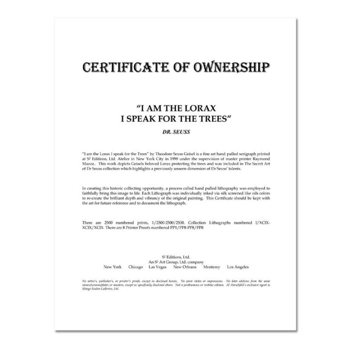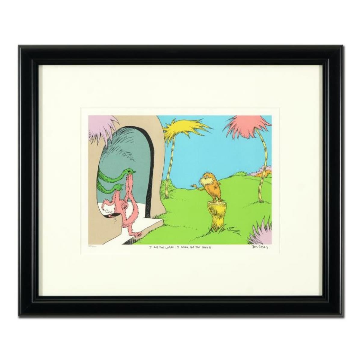 I Am The Lorax, I Speak For The Trees by Dr. Seuss. "I Am The Lorax, I Speak For The Trees" by Dr Seuss is an estate signed limited edition lithograph on paper. Numbered from an edition of 2500 pieces, it is accompanied by a Letter of Authenticity. Measures approximately 21.5" x 17.5" (Framed), 16" x 12" (image).