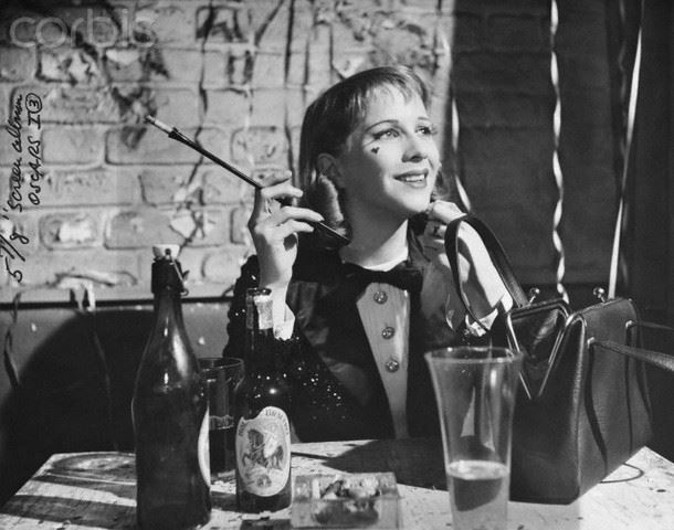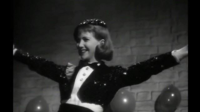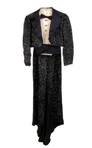 In the precursor to Cabaret (1972) starring Liza Minnelli, Julie Harris played freewheeling cabaret singer Sally Bowles in the film I Am a Camera (1955) and first appears onscreen (at 7-minute mark) wearing this black sequined outfit of high-waisted pants, satin lapel bolero, and sleeveless tuxedo vest with black bow tie and cummerbund. The year 1955 was good to actress Julie Harris with East of Eden's release on March 9th and I Am A Camera's release on July 21st. This costume and accompanying copy of commemorative tribute with photograph come directly from the Julie Harris Estate.