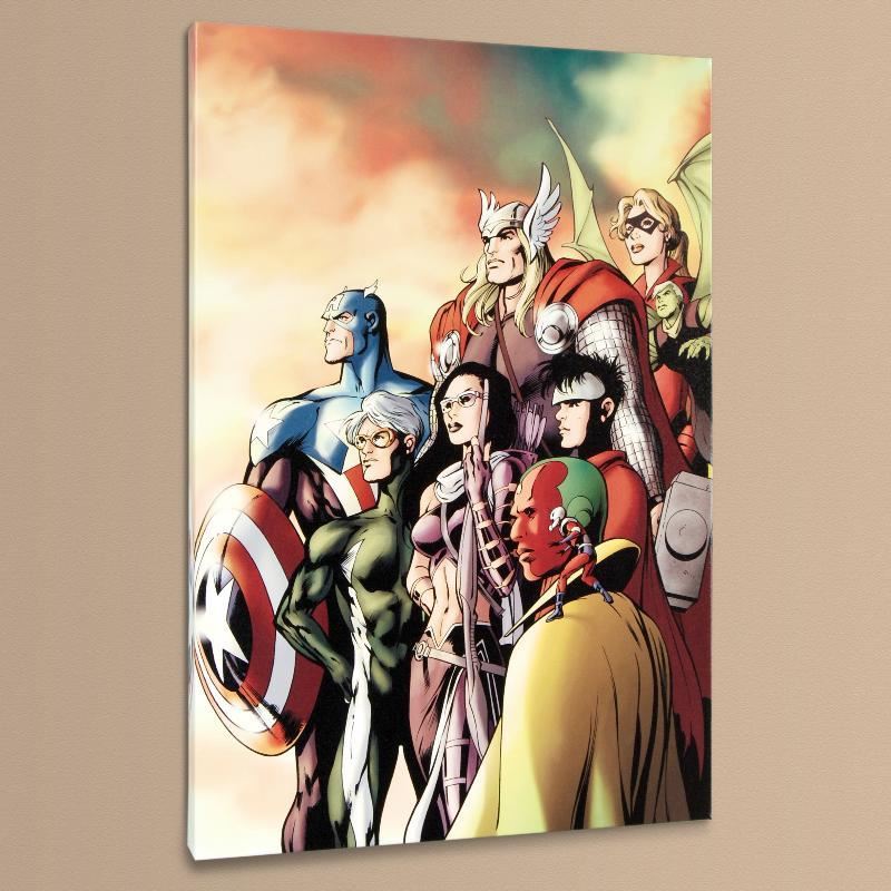 A piece of comic book history, this limited edition, from original art by Alan Davis, depicts Ant-Man,Vision, Hawkeye, Wiccan, Speed, Captain America, Thor, Hulkiling, and Stature. An English artist, Alan Davis, began his career in comics on an English magazine, his first professional work was a strip called The Crusader. His big break was drawing the revamped Captain Britain story in The Mighty World Of Marvel. In 1985 Davis was hired by DC Comics to draw their Batman and the Outsiders title, and in 1987 he moved to Marvel Comics in the US, where he worked on titles such as The Uncanny X-Men and eventually launched the comic Excalibur. "I Am an Avenger #5" is a limited edition numbered giclee on stretched canvas by Alan Davis presented by Marvel Comics. This piece comes gallery wrapped. Includes Certificate of Authenticity! Measures approx. 18" x 27" (image); 1.5" (depth).