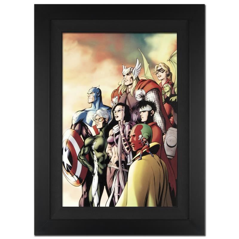 A piece of comic book history, this limited edition, from original art by Alan Davis, depicts Ant-Man,Vision, Hawkeye, Wiccan, Speed, Captain America, Thor, Hulkiling, and Stature. An English artist, Alan Davis, began his career in comics on an English magazine, his first professional work was a strip called The Crusader. His big break was drawing the revamped Captain Britain story in The Mighty World Of Marvel. In 1985 Davis was hired by DC Comics to draw their Batman and the Outsiders title, and in 1987 he moved to Marvel Comics in the US, where he worked on titles such as The Uncanny X-Men and eventually launched the comic Excalibur. "I Am an Avenger #5" is an extremely limited edition giclee on canvas by Alan Davis presented by Marvel Comics, hand signed by the great Stan Lee and numbered out of only 4! This piece comes custom framed and ready to hang. Includes Certificate of Authenticity! Measures approx. 29" x 40" (with frame); 22" x 33" (image).