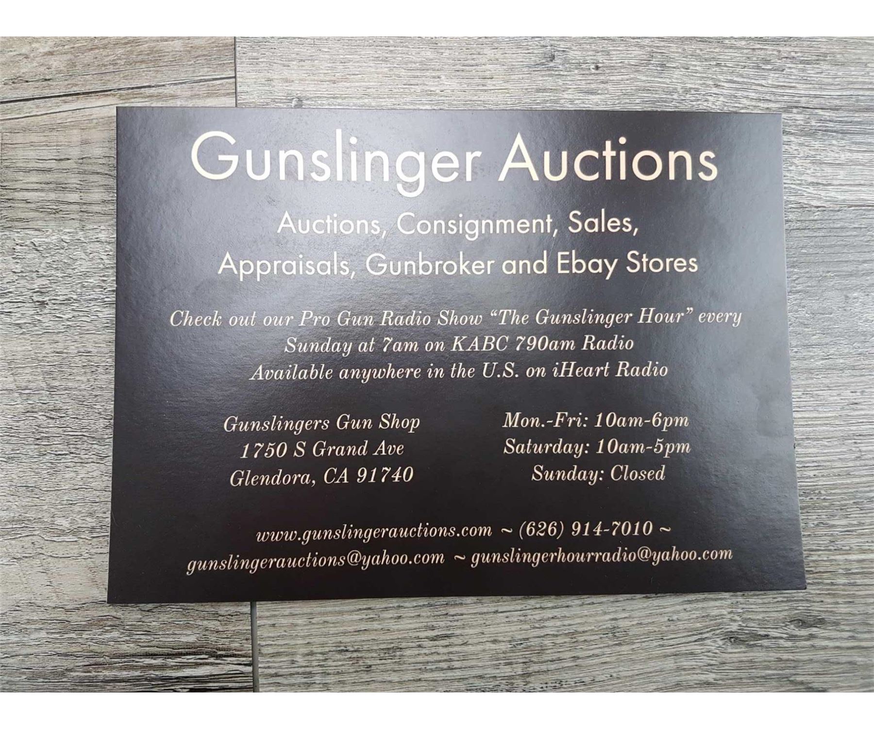 14. ALL FIREARMS WILL BE SOLD BY Gunslinger Auctions, a Federal Firearms License (FFL) Licensee in California. California BUYERS-Must pass the California Bureau of Investigations background check for all firearms. A $35 fee will be charged for the background check. If you do not pass the background check, you still must pay for the firearm(s), and they will be sold at a later auction and appropriate commission will be charged. Guns must be picked up by the purchaser at Gunslinger Auctions. All purchases will be charged to your credit card the day after the auction, once shipping charges are determined, your credit cards will again be charged for shipping. No one but the purchaser will be allowed to pick up the firearms. BUYER'S FROM OUTSIDE CALIFORNIA OR OUT OF AREA BUYERS- IMMEDIATELY FOLLOWING THE AUCTION YOUR CREDIT CARD WILL BE CHARGED FOR YOUR PURCHASES AND BIDDING FEE'S. YOU ARE REQUIRED TO Contact a Federally licensed firearm dealer in your state who will accept shipment and transfer the firearm to you in your state. YOU ARE RESPONSIBLE TO DETERMINE YOUR ABILITY TO PURCHASE A FIREARM IN YOUR STATE. IF YOU FAIL TO QUALIFY IN YOUR STATE YOU WILL THEN OWN A WEAPON THAT YOU CAN'T POSESS. ALL SALES ARE ABSOLUTELY FINAL ON THE DAY OF SALE. Gunslinger Auctions will arrange shipping on all firearms through a local pack/ship company or a national company of your choice. The cost of the shipping will be paid by the purchaser prior to shipment. HANDGUN'S REQUIRE OVERNIGHT SHIPPING. Visa, Master Card and American Express are accepted for payment. YOU MUST BE OVER 21 YEARS OLD TO BUY LONG GUNS. YOU MUST BE OVER 21 YEARS OLD TO BUY HANDGUNS ATF FORMS WILL BE FILLED OUT ON ALL GUNS, with the exception of pre 1898 antique's. Gunslinger Auctions has not fired any firearm in this auction (Unless otherwise noted). As such we cannot and do not warranty these items. Our conditions range from New in Box, Outstanding, Excellent, Very Good, Good, Fair & Poor. Please pay attention to our ratings. They are our opinions ONLY, so you should make every effort to inspect them yourselves.