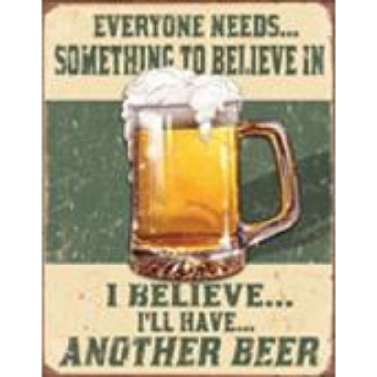 Everyone needs something to believe in, beer, metal pub bar sign. 12 12 1/2" X 16" with pre-drilled holes for mounting.