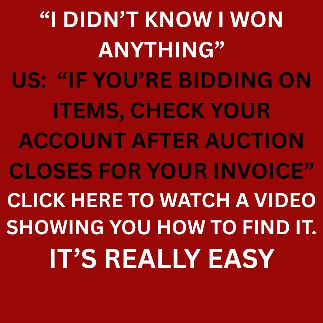 IF YOU'RE BIDDING ON ITEMS AND NOT SURE YOU WON, CHECK YOUR LIVE AUCTION WORLD ACCOUNT AFTER THE AUCTION HAS CLOSED TO SEE IF YOU HAVE AN INVOICE. ALSO, IN YOUR ACCOUNT SET UP TO BE NOTIFIED WHEN YOU WIN AN ITEM.