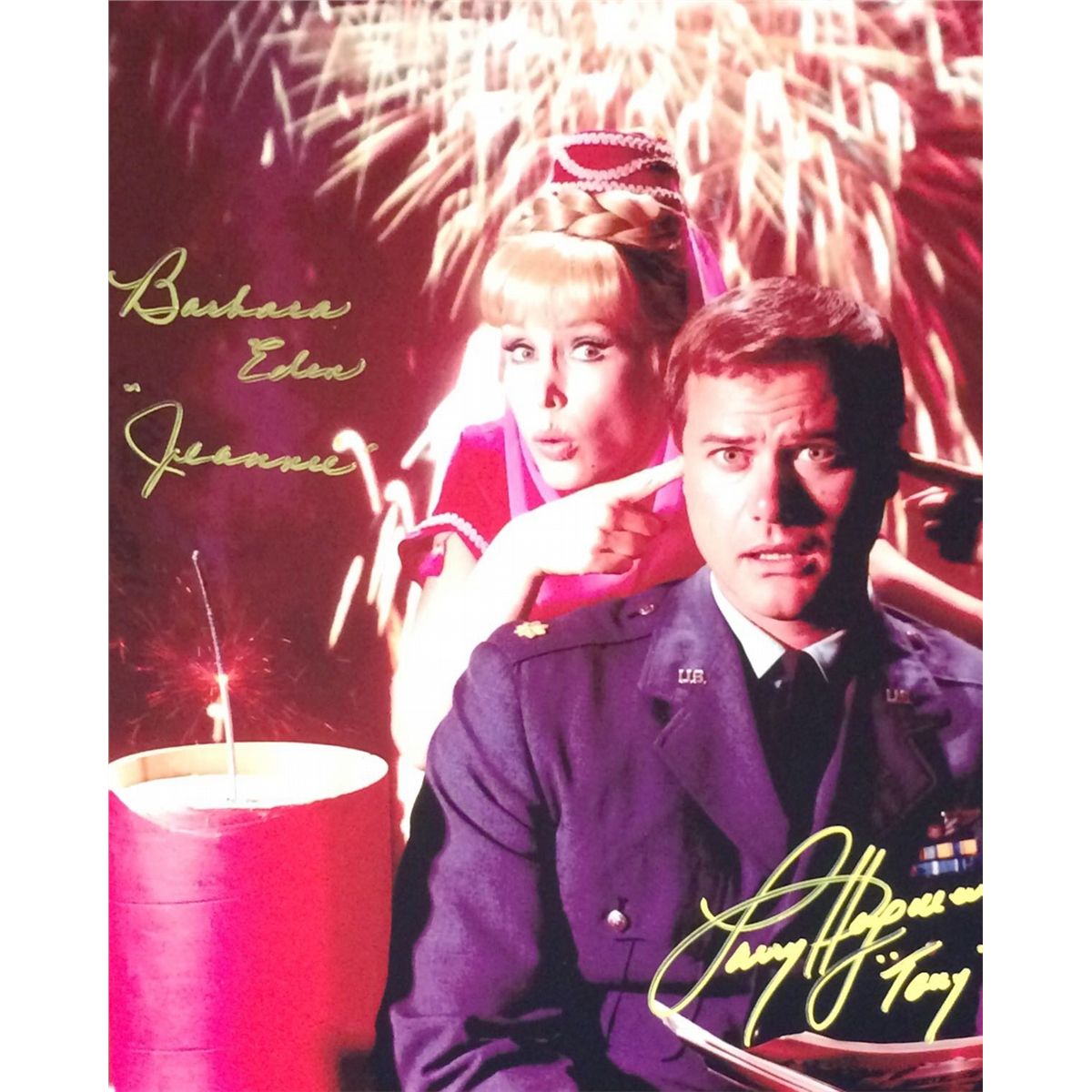 Large signed 11x14 signed by Eden and Hagman and both added their character names her writing Jeannie and Tony. Rare and only 100 like these were ever signed